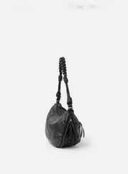 Beautiful hand-braided gusset and shoulder strap. Zipper closure, adjustable and removable crossbody strap, external and internal pockets, and cotton lining.