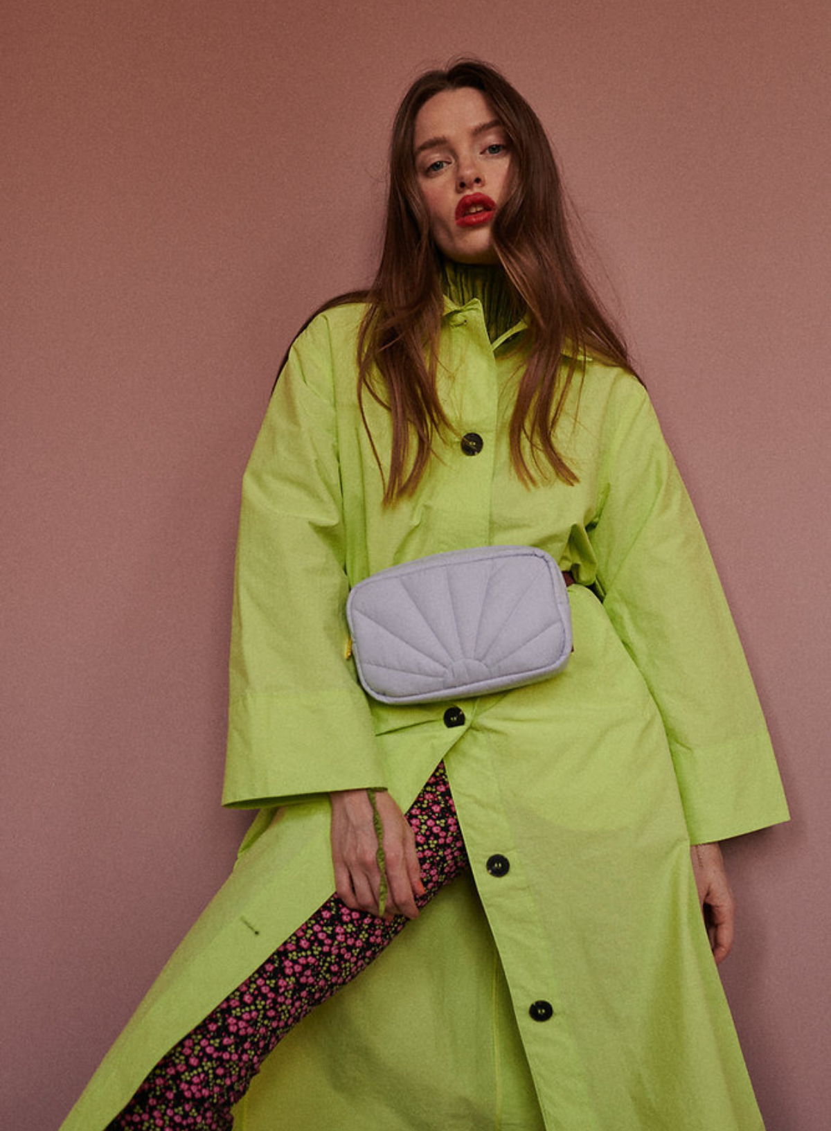 A hortensia blue fanny bag. The lining is made of a cool & chic striped canvas and has a golden YKK zipper.