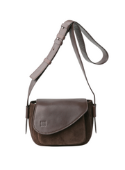 Washed cowhide and suede crossbody bag. Adjustable shoulder strap. Flap and magnet closure. Multiple external and internal pockets. Cotton lining.
