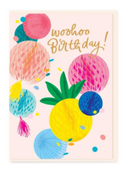 Colourful party decorations and confetti with a gold foil type, 'Woohoo Birthday' message.