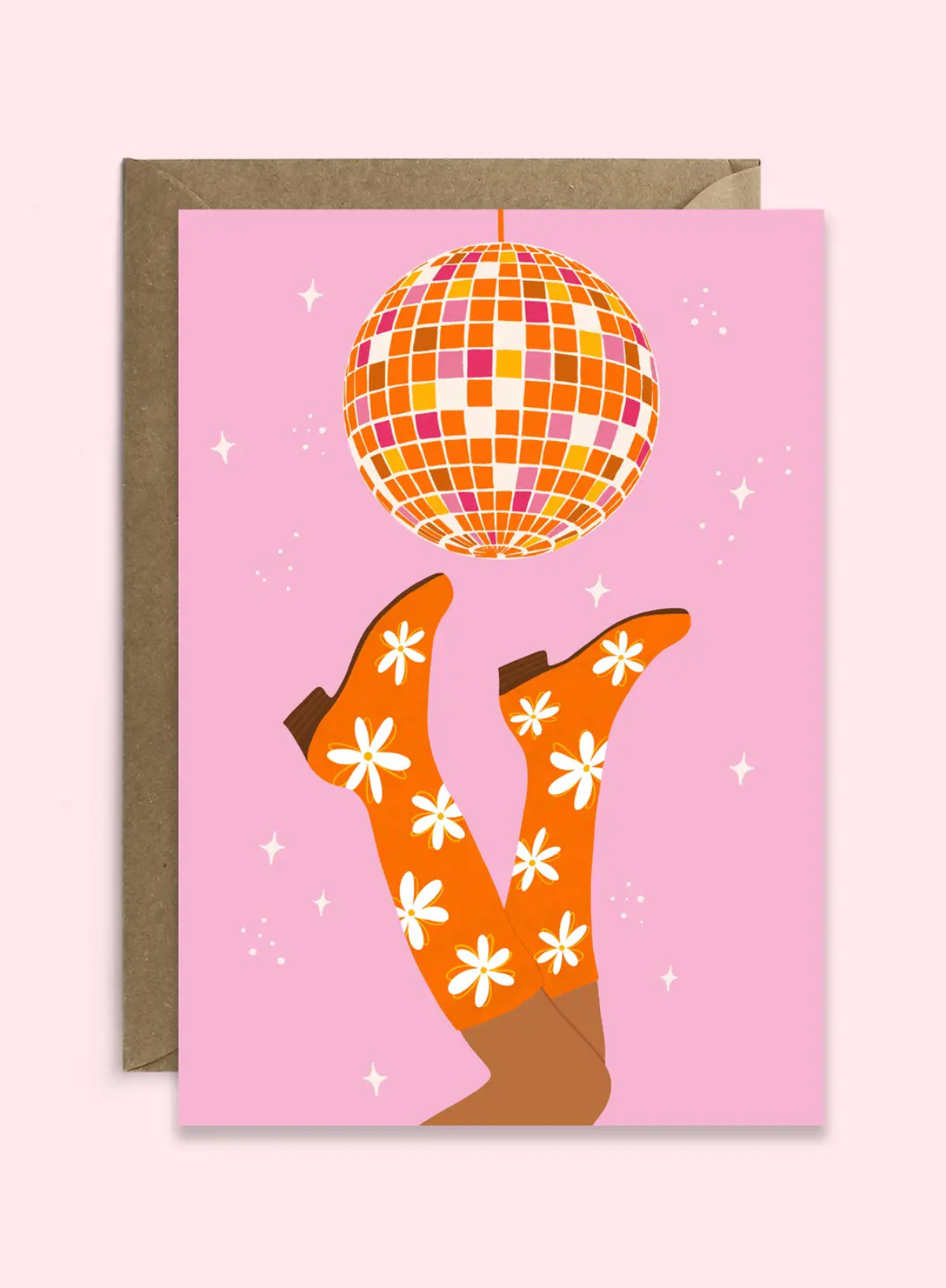 The soft pink background on the greeting card is topped with an orange disco ball and a pair of legs decked out in orange, daisy-patterned knee-high boots.