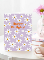 Cheerful illustrated daisies bloom across a lilac background, with an orange “Happy Birthday” caption in a 70s style font.