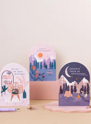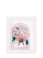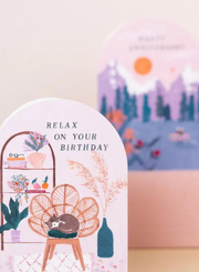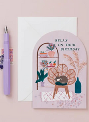 Luxury arch shape birthday card with illustration of a sleeping cat on a bamboo chair in cozy bohemian room.