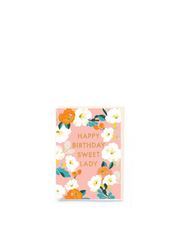 Pretty white flowers on soft pink with rose gold foil type, 'Happy Birthday Sweet Lady' message.