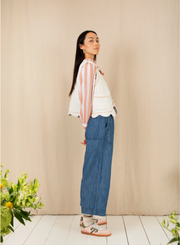 Lined in organic cotton + featuring a contrast hand-stitch detail + hand stitched press-stud fastenings.