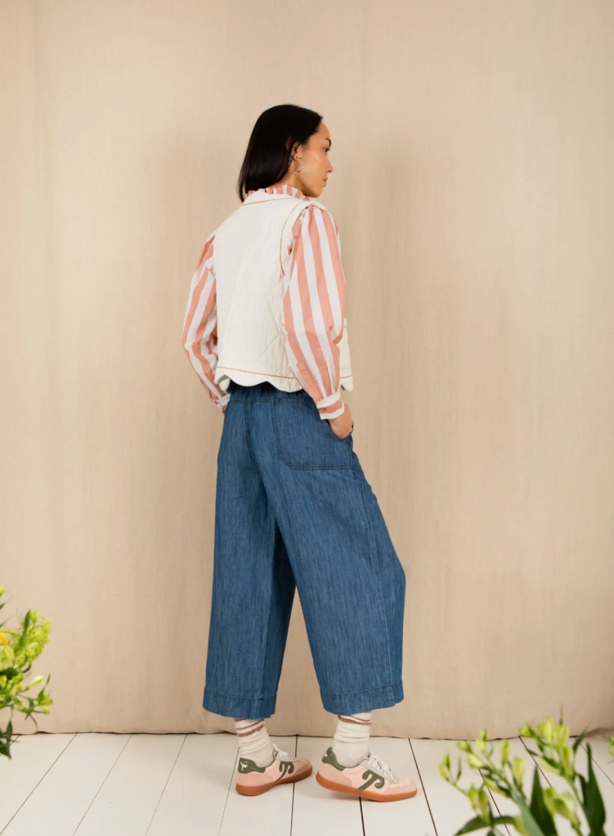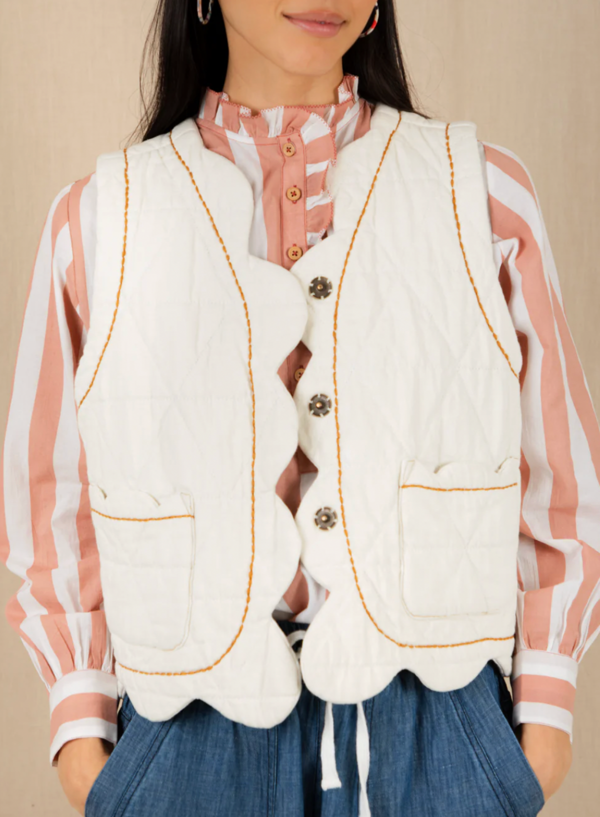 A beautiful + individual, quilted, garment-washed Gillet in an organic cotton twill, with a unique scallop edge detail.