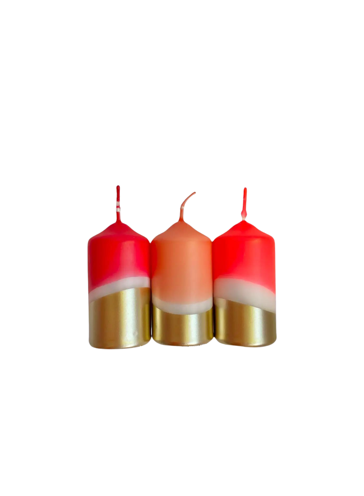 Set of three lovingly hand dipped pillar candles. The delicate shades in the upper part of the candle are complemented by a cool gold tone. Due to the handwork, each candle is a special one-of-a-kind with slight variations in the color gradients. Carefully selected paraffin from regional production in Bavaria.