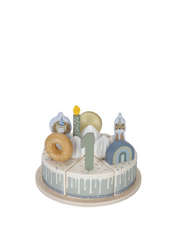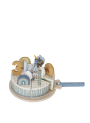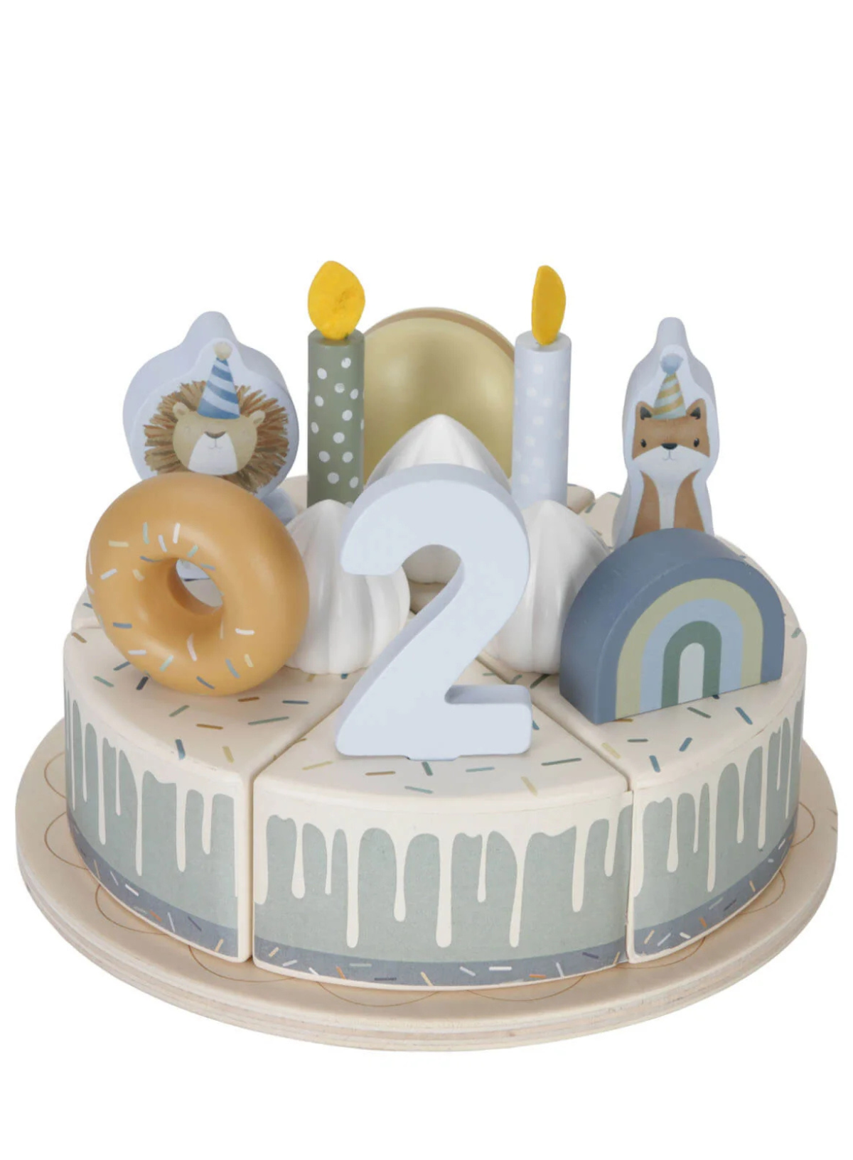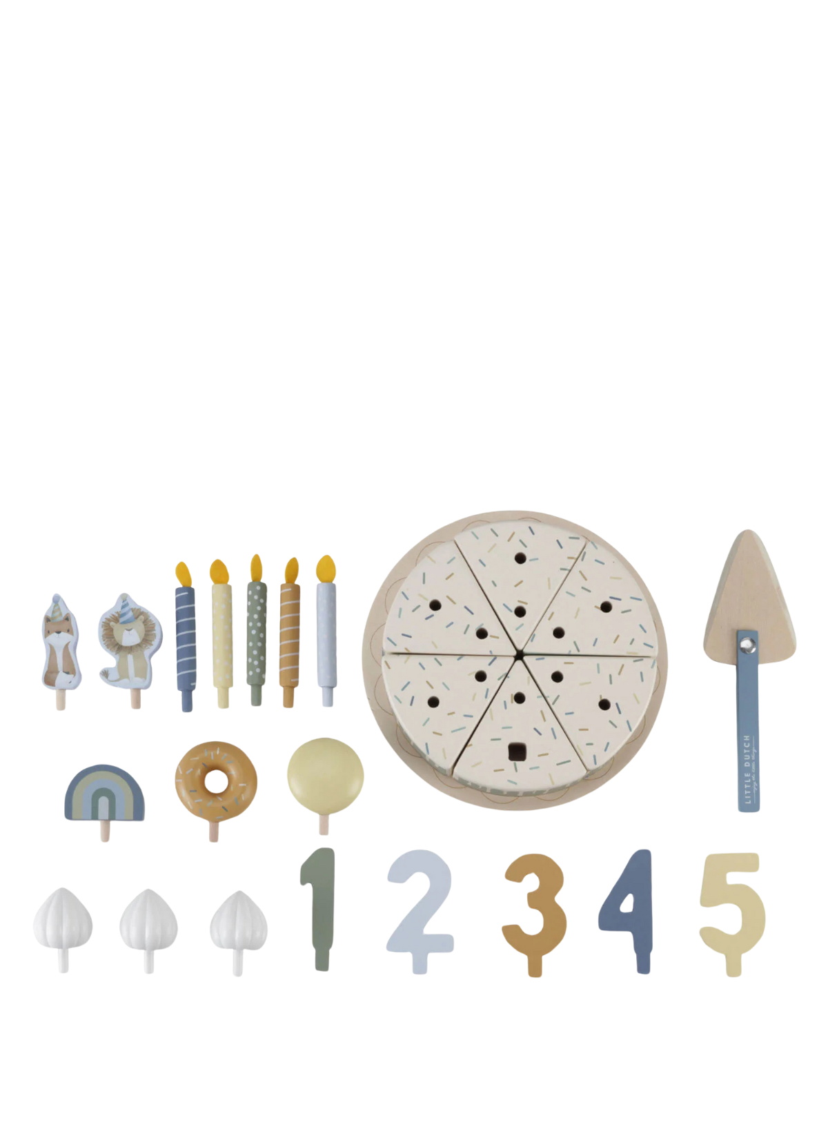 Have fun at the party. The set includes six pieces of cake on a tray, a cake server, donut, macaron, lion, fox, rainbow, candles, whipped cream toppers and number toppers (1-5).