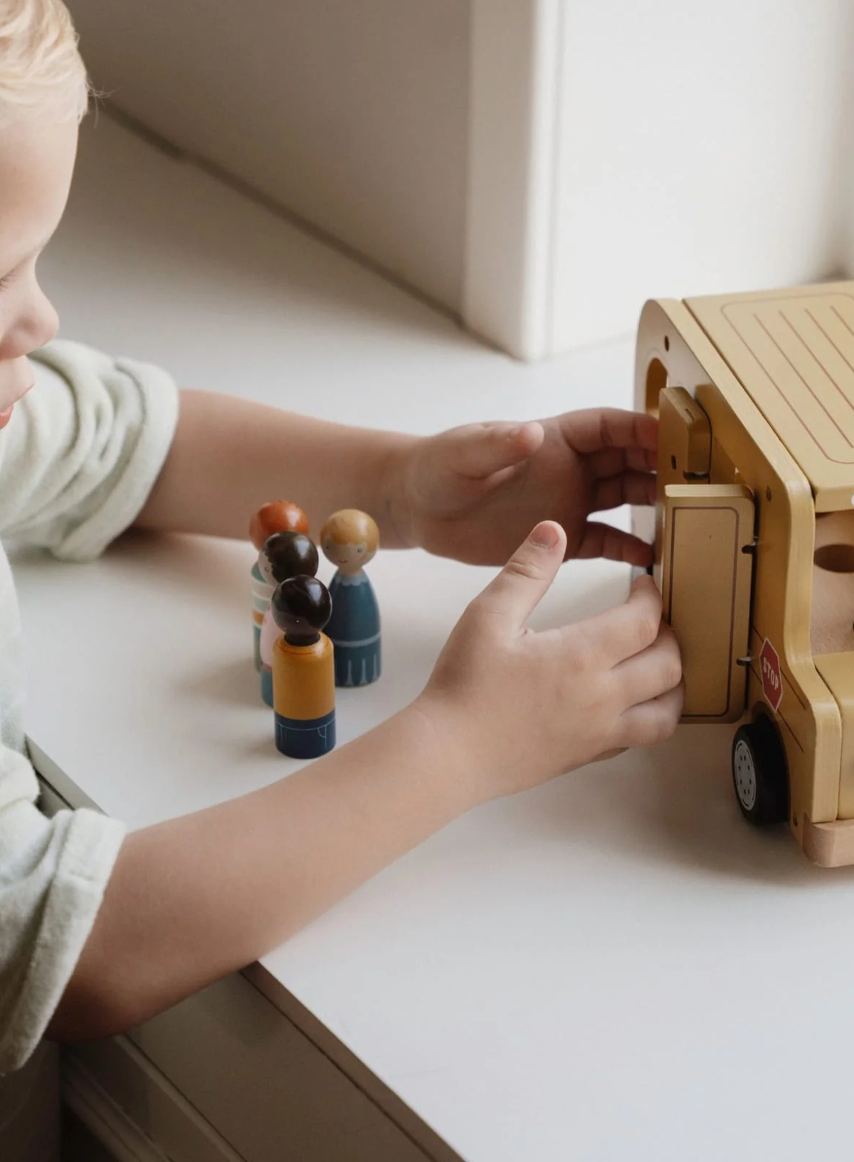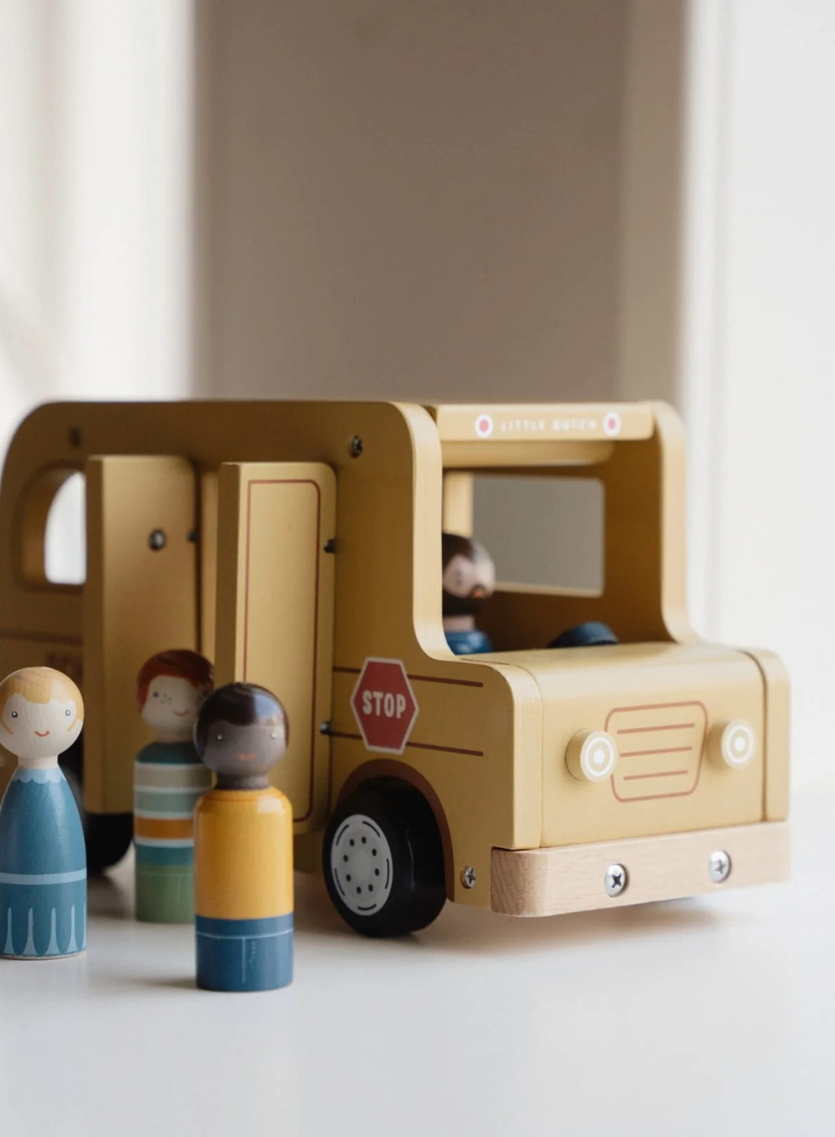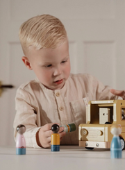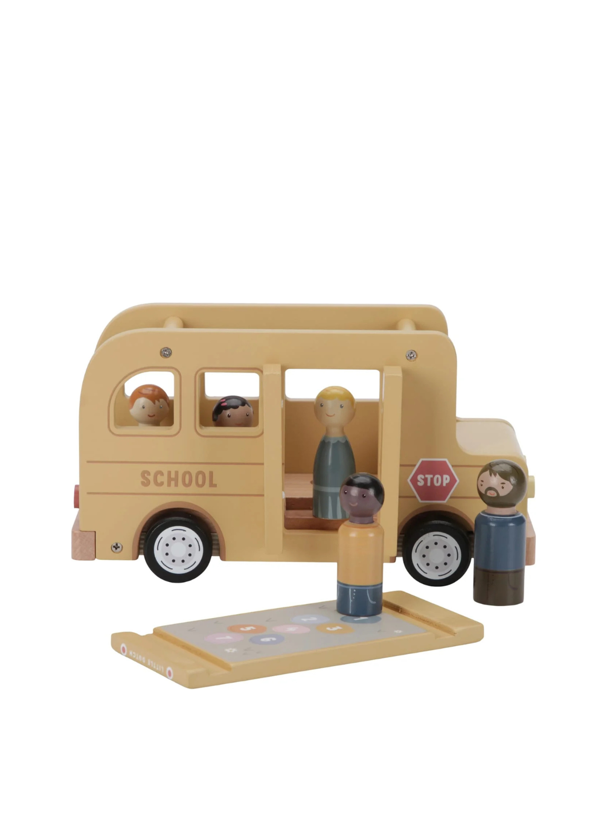 The smooth-rolling wheels allow your little one to effortlessly ride across the floor, picking up friends from every corner of the room. The door and roof of the wooden school bus can open and the figures are compatible with the dollhouse and other playsets such as the airplane and car with caravan.