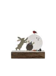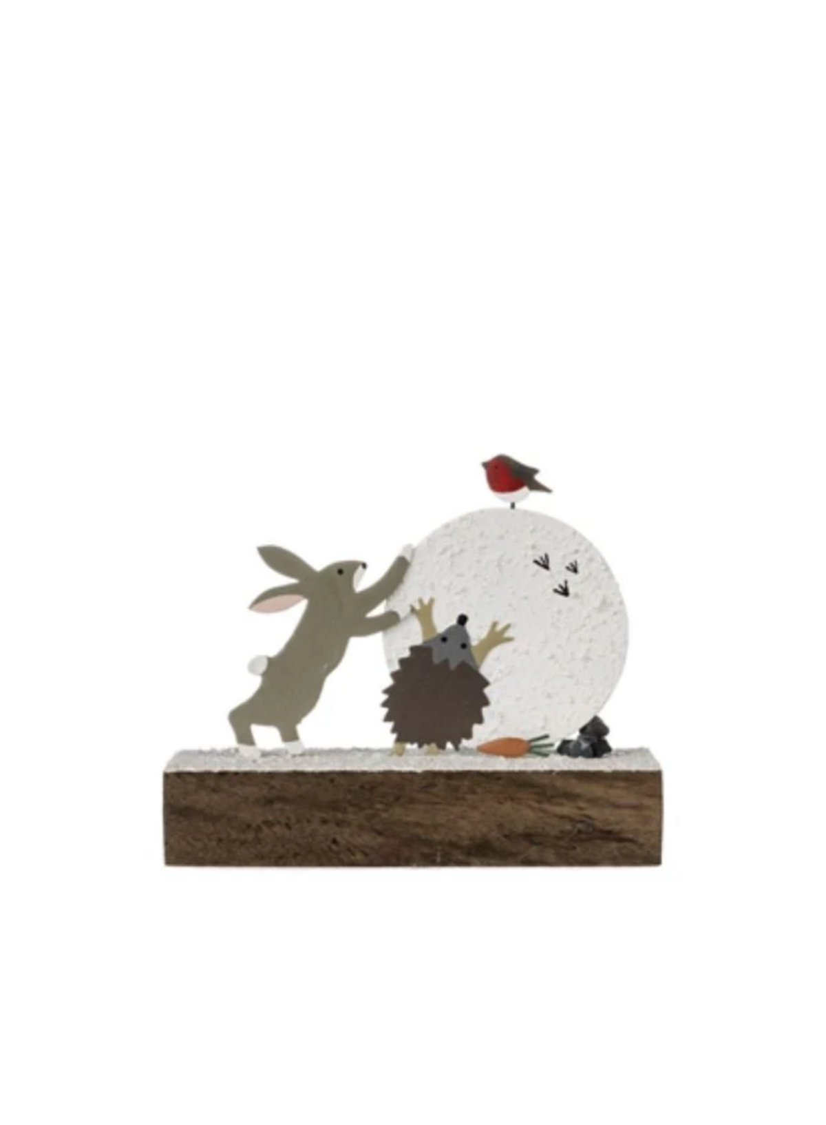 A hare and his friend the hedgehog, push a giant snowball from which their snowman will eventually take shape. Meanwhile, a robin perches on top. In this fun Christmas scene from Shoeless Joe, the characters are fashioned from metal and mounted on a snow covered wooden plinth.