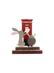 Posting card letterbox block Christmas decoration featuring a hare and a hedgehog
