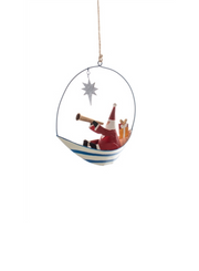 Painted metal hanging Christmas decoration featuring Santa in a boat with a telescope and star