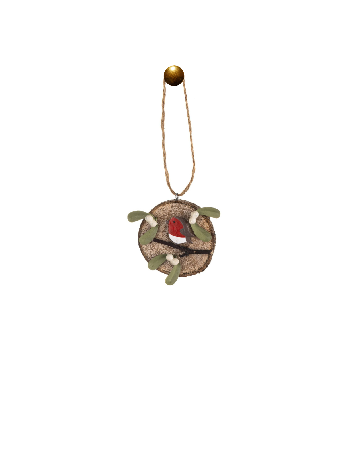This charming decoration features a robin perched on a log round, gently holding mistletoe.