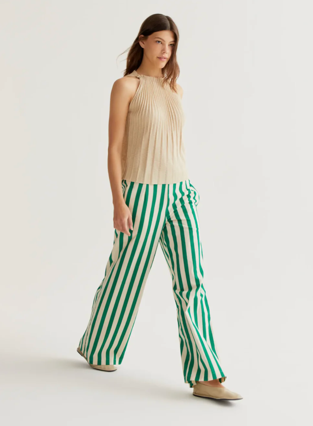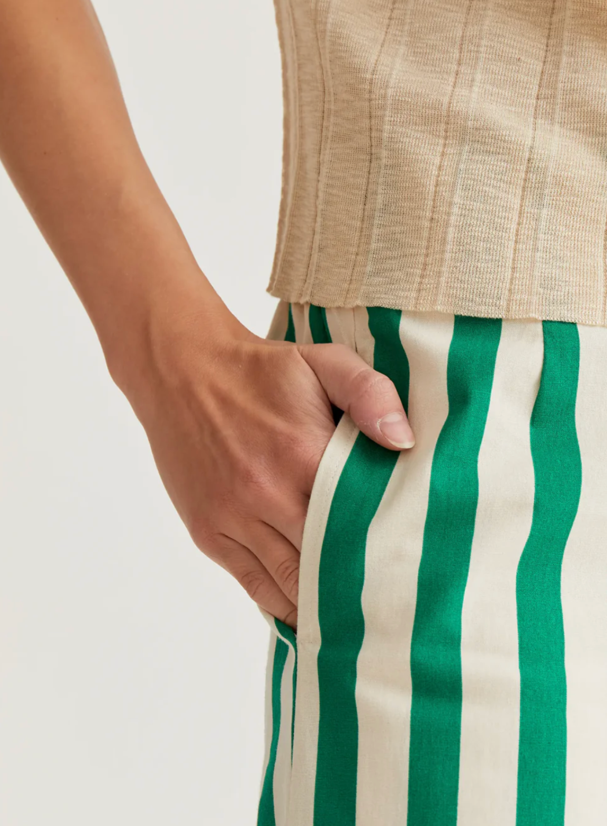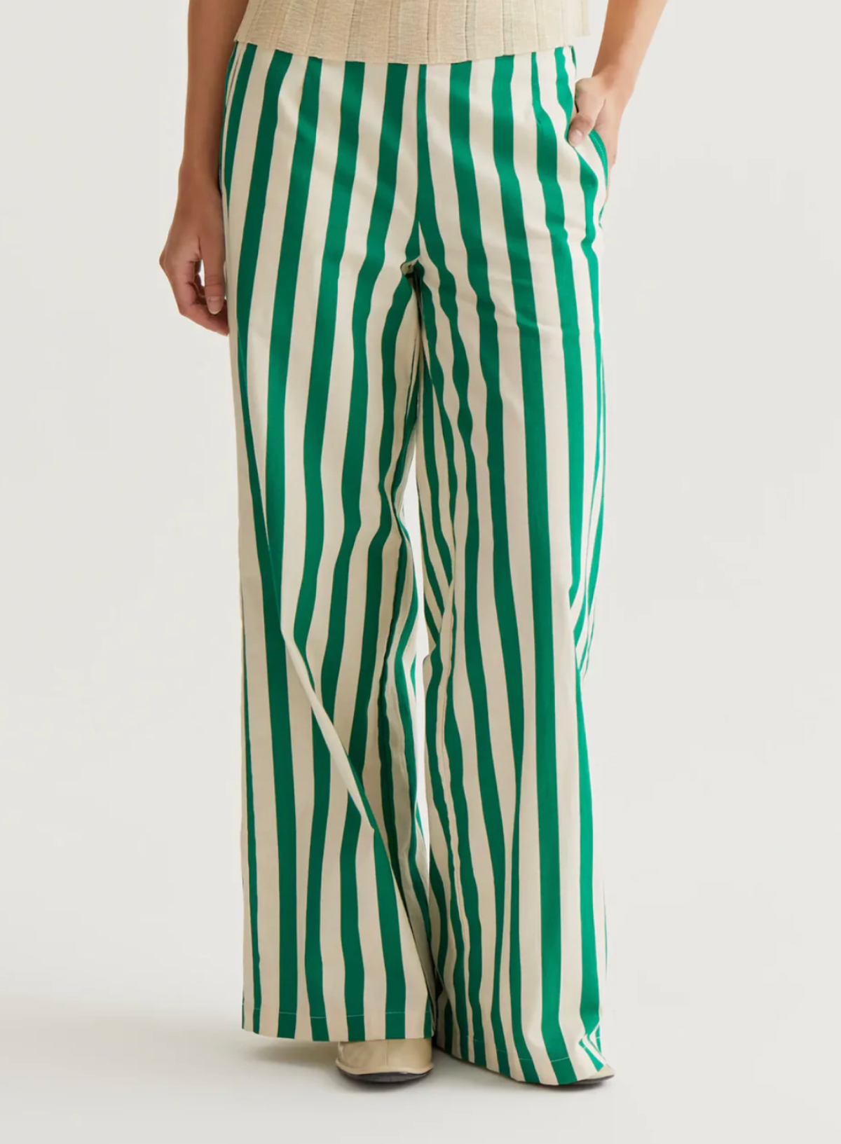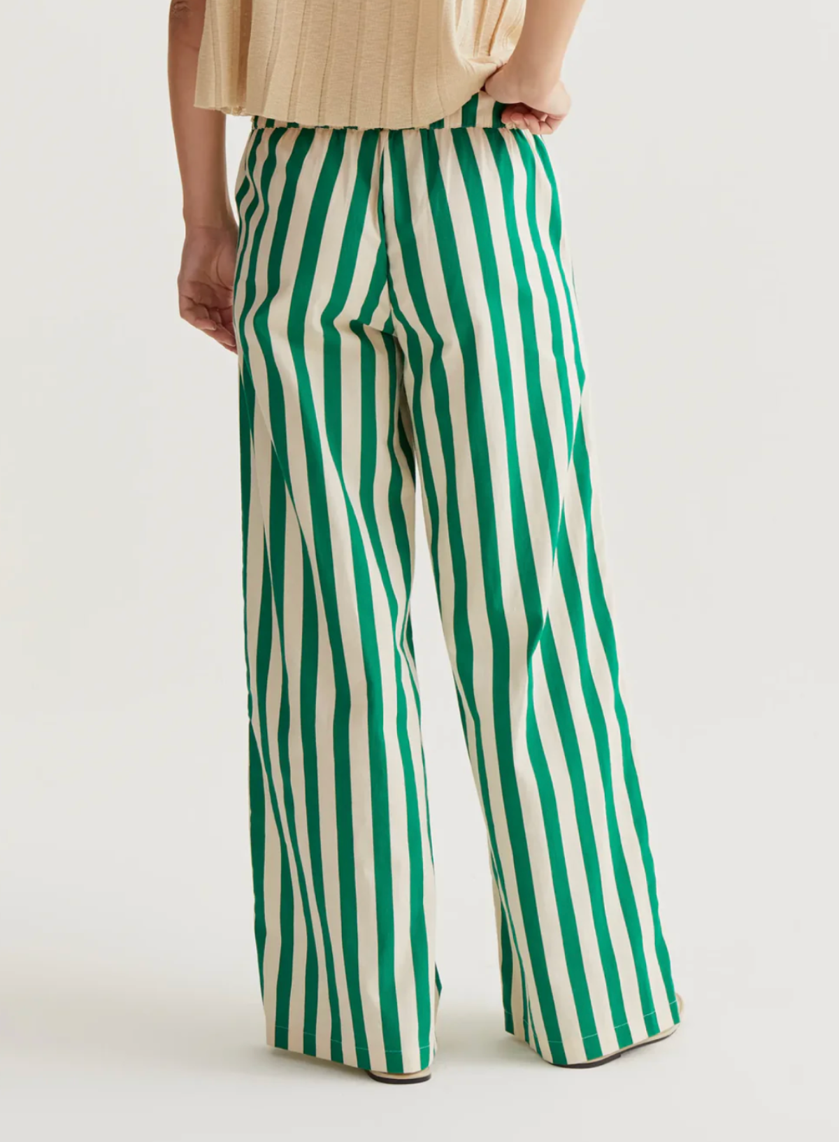 Trousers made from 100% cotton with a bamboo green print. High-waisted elasticated fixed waistband. Side pockets.