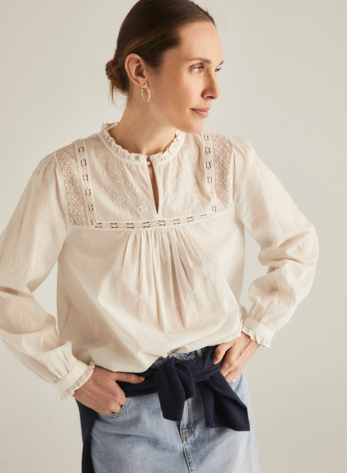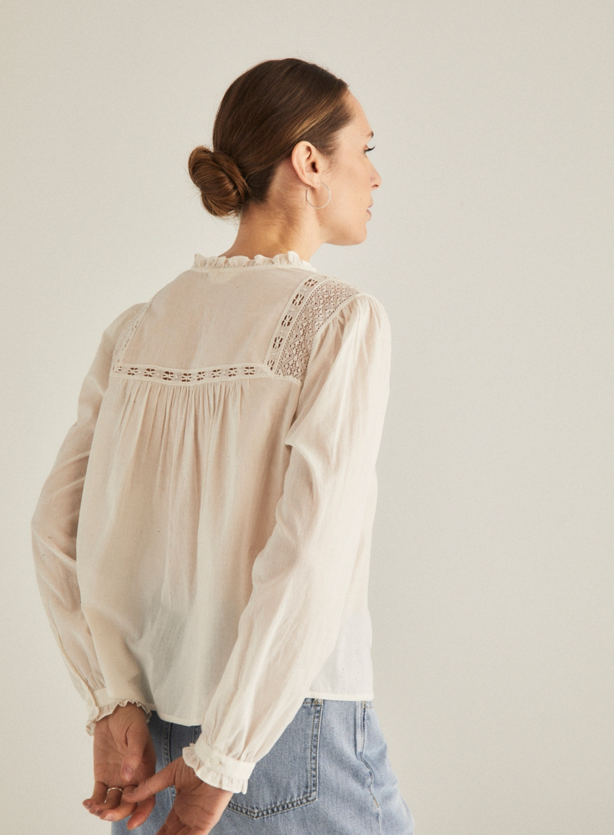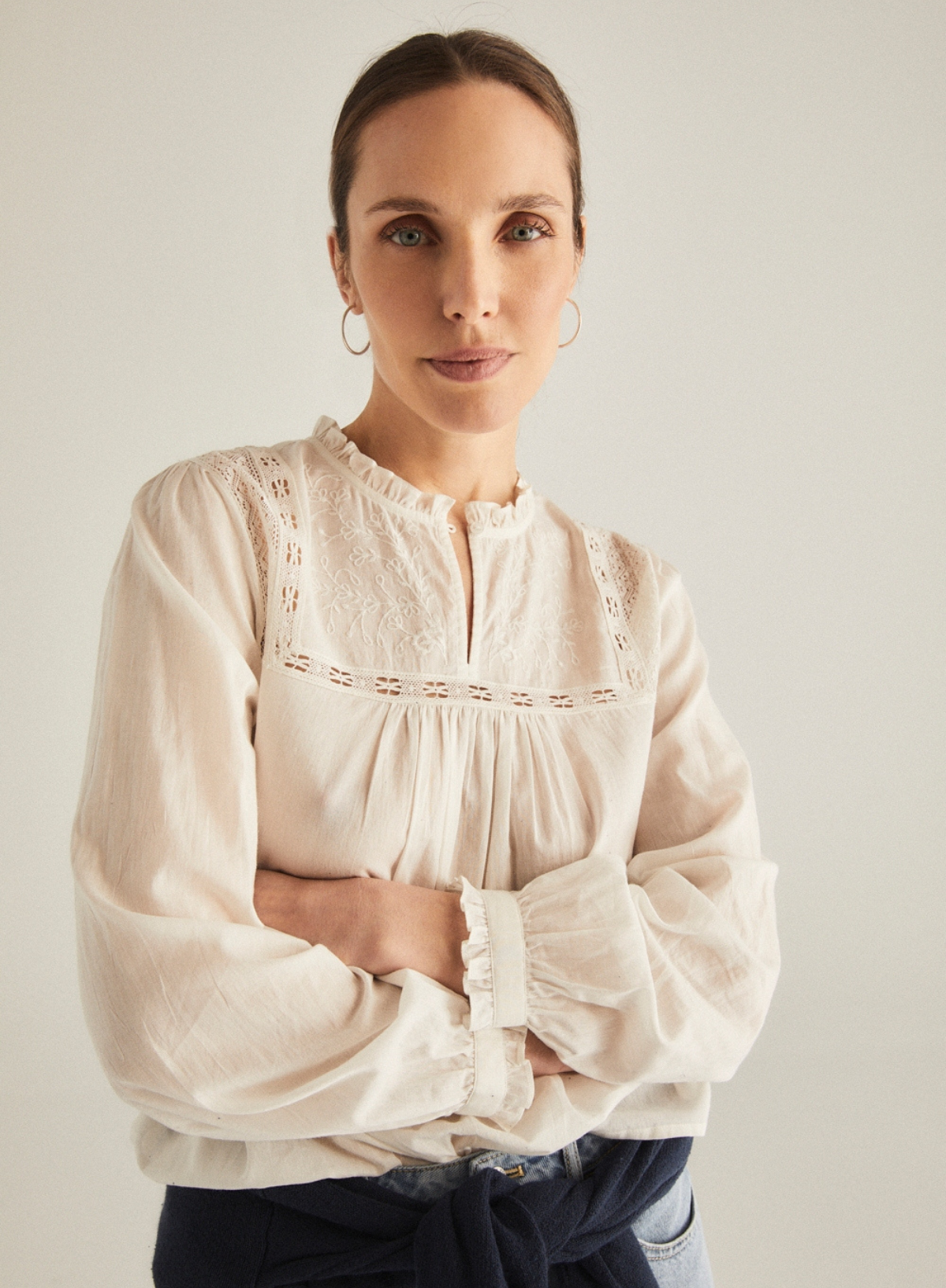 Romantic shirt. 100% cotton. Embroidered design. Round neck with ruffle details. Long sleeves with ruffle details on the cuffs and button fastening. Fastens with front button.