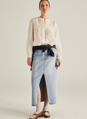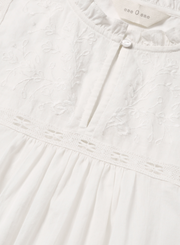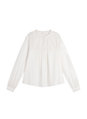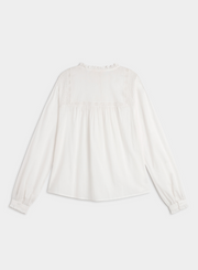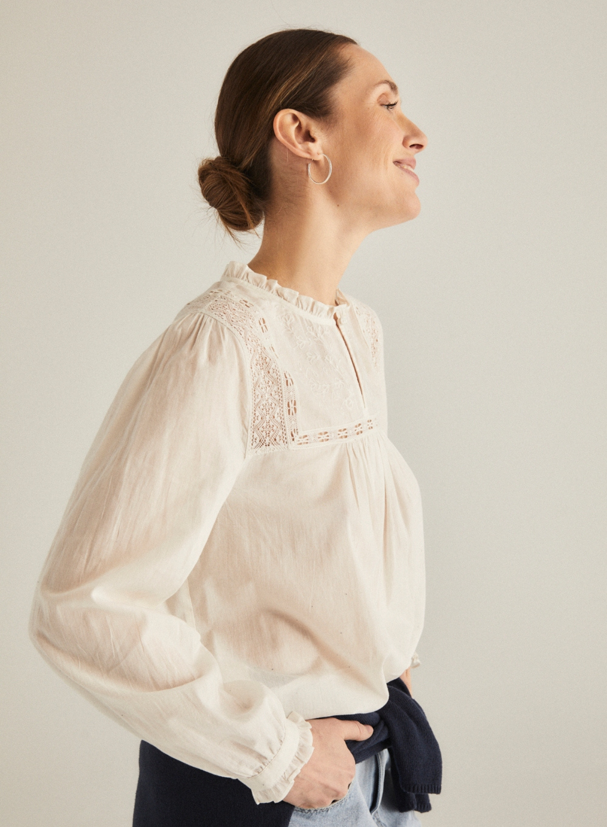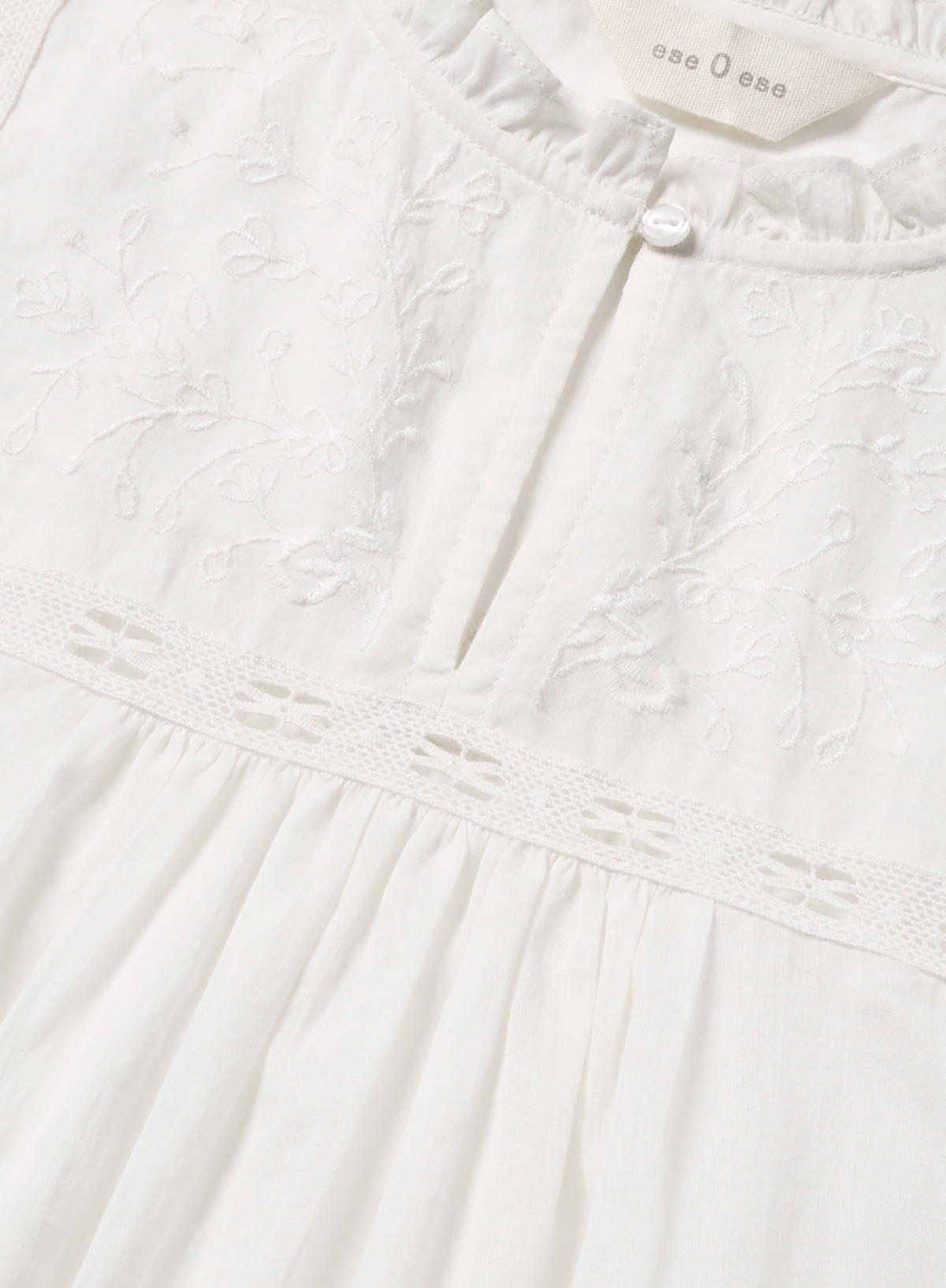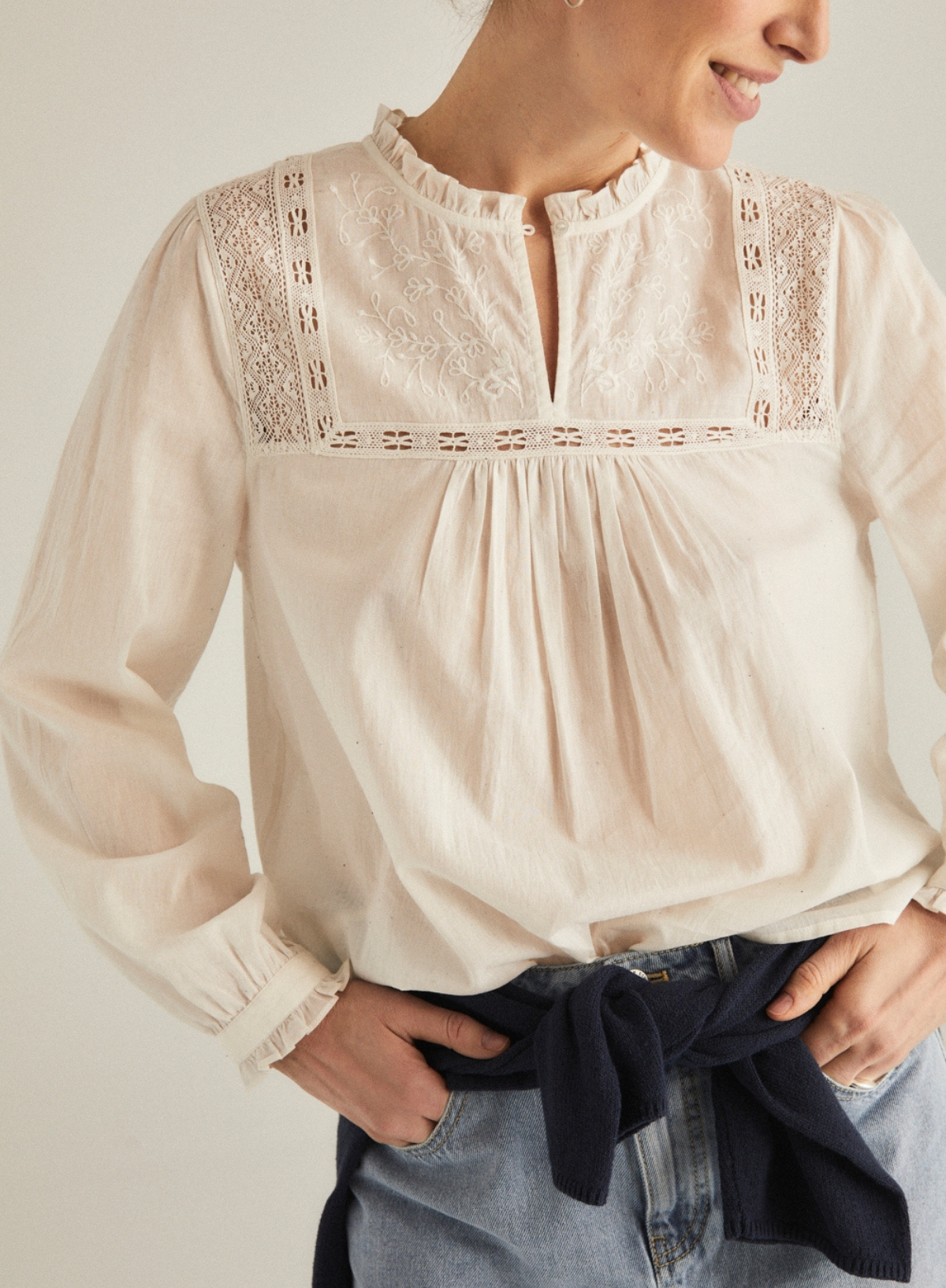 Romantic shirt. 100% cotton. Embroidered design. Round neck with ruffle details. Long sleeves with ruffle details on the cuffs and button fastening. Fastens with front button.