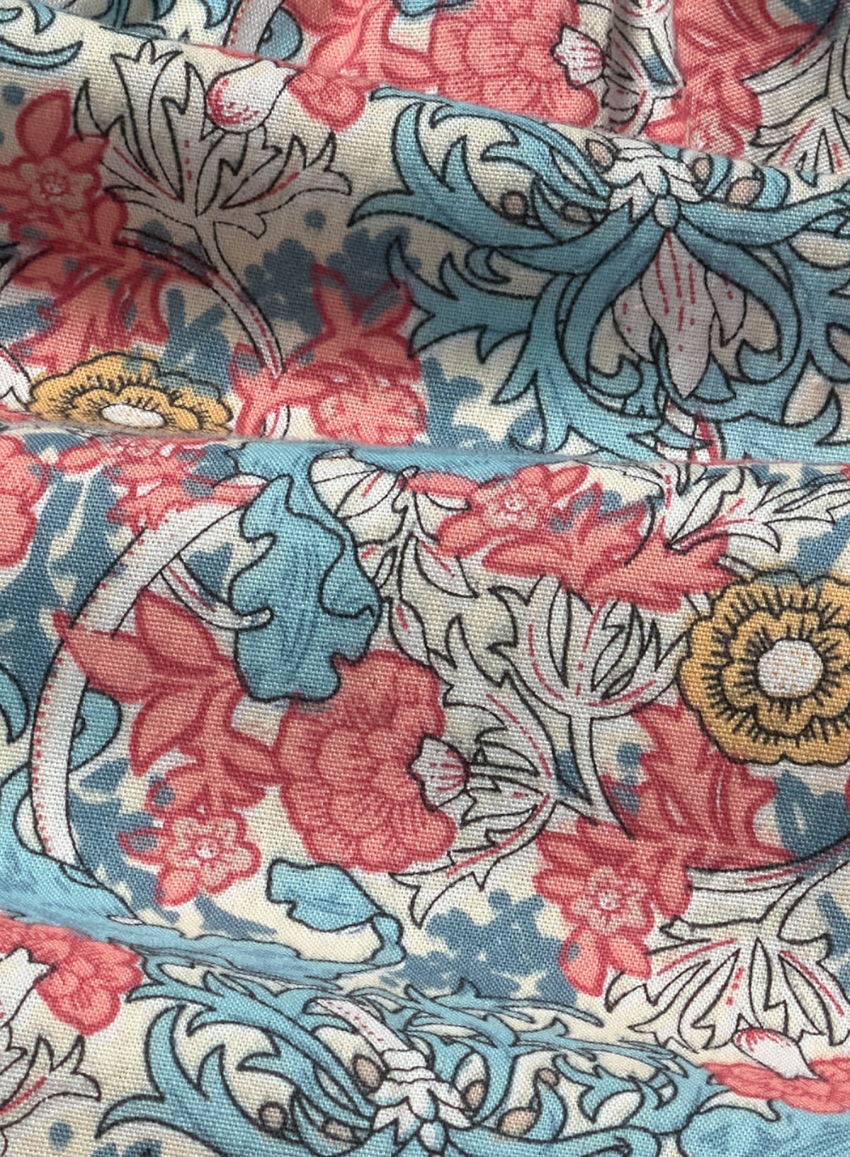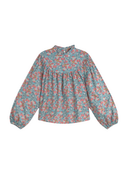Romantic shirt. 100% cotton fabric. Floral print design. Round neck with back button. Long puffed sleeves. Straight fit. Garment length for size S: 59.5 cm.