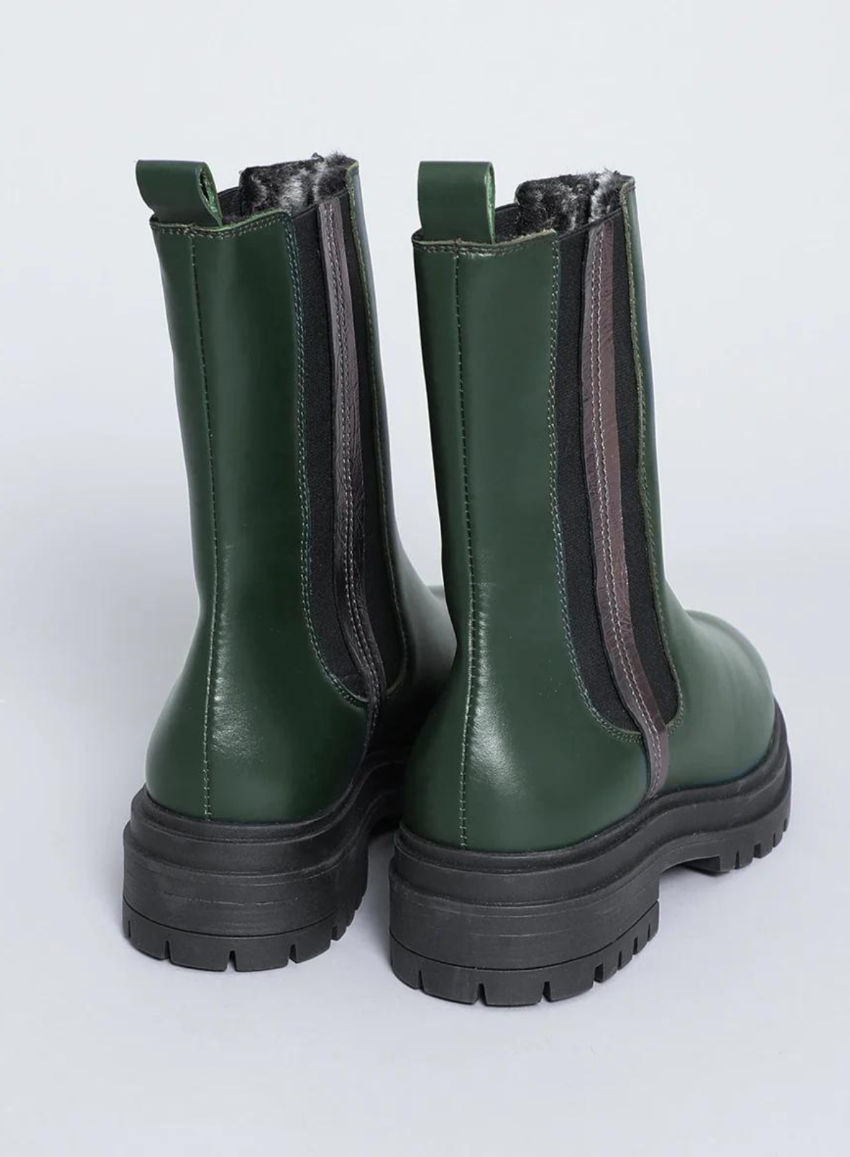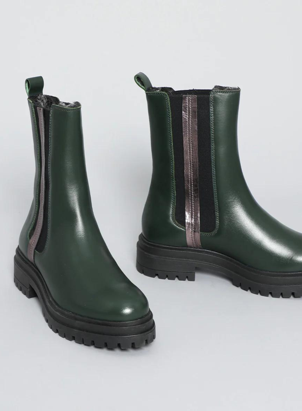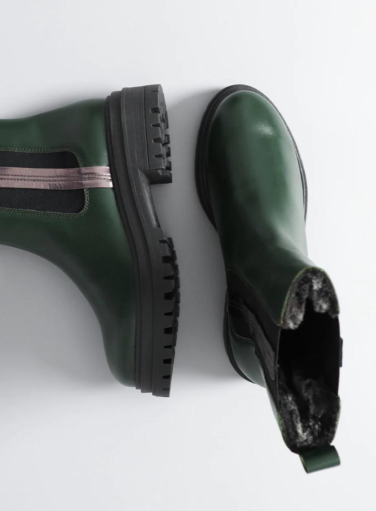 A stylish and modern Chelsea boot with comfort in mind. Soft green leather with a metallic rose gold strip to add drama, fur lining and thick rubber sole. You will be surprised at how light these boots are. They are versatile, easy to style, and will keep you warm!