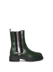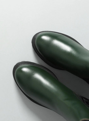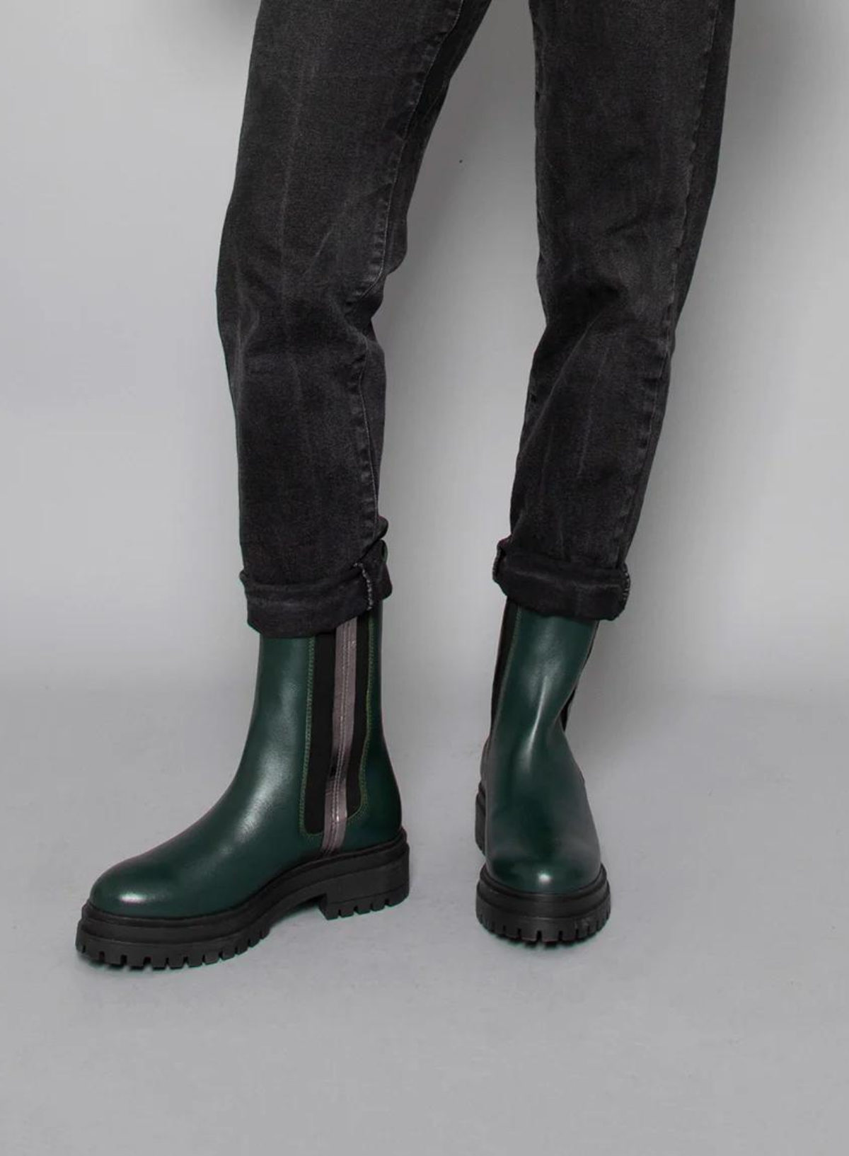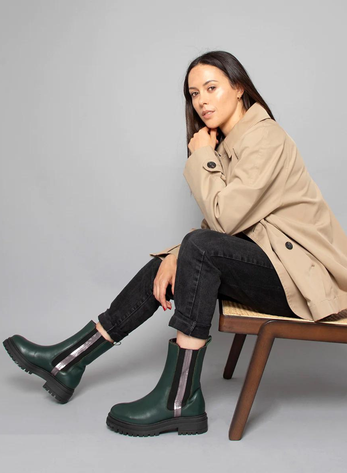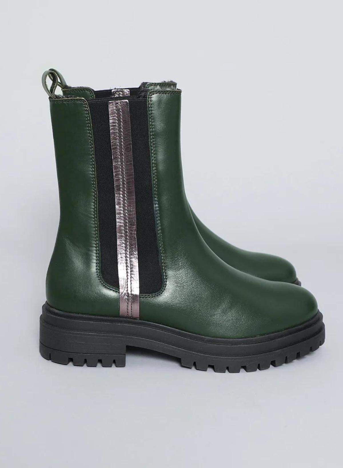 A stylish and modern Chelsea boot with comfort in mind. Soft green leather with a metallic rose gold strip to add drama, fur lining and thick rubber sole. You will be surprised at how light these boots are. They are versatile, easy to style, and will keep you warm!
