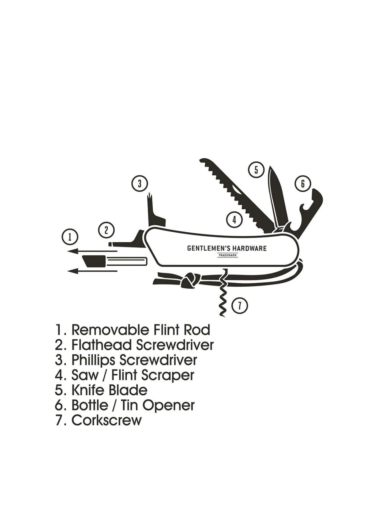 • Includes a knife blade, a saw, a tin/bottle opener, a corkscrew, a flat-head screwdriver, a Phillips screwdriver and a removable flint rod.