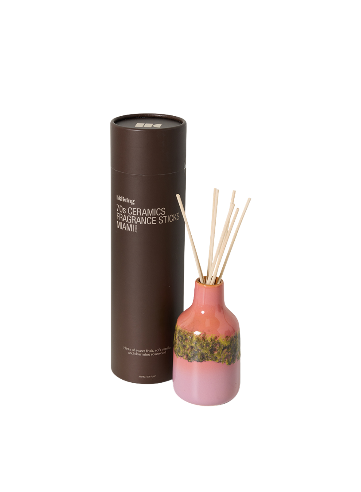 Part of our 70s ceramics collection, combining nostalgic style with subtle scent. Let fruity notes fill the air with vibrant zest. As the fragrance settles, a warm, creamy vanilla emerges, evoking the luxurious feel of Miami's beaches. The enchanting aroma of rosewood adds a sophisticated depth that captures the city's rich cultural charm. This balanced fragrance brings the vibrant energy and relaxed aesthetic of Miami into your home.