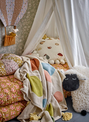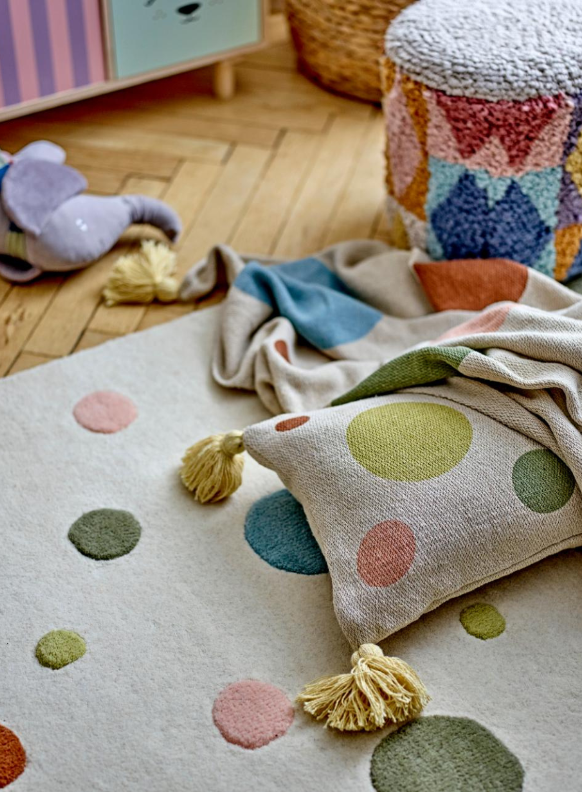 The Clennie Throw by Bloomingville MINI, made from recycled cotton, is perfect for cozy moments. Its pattern of dots in varying sizes and lovely colours adds a playful touch to the children's room.