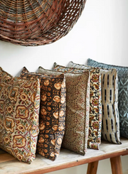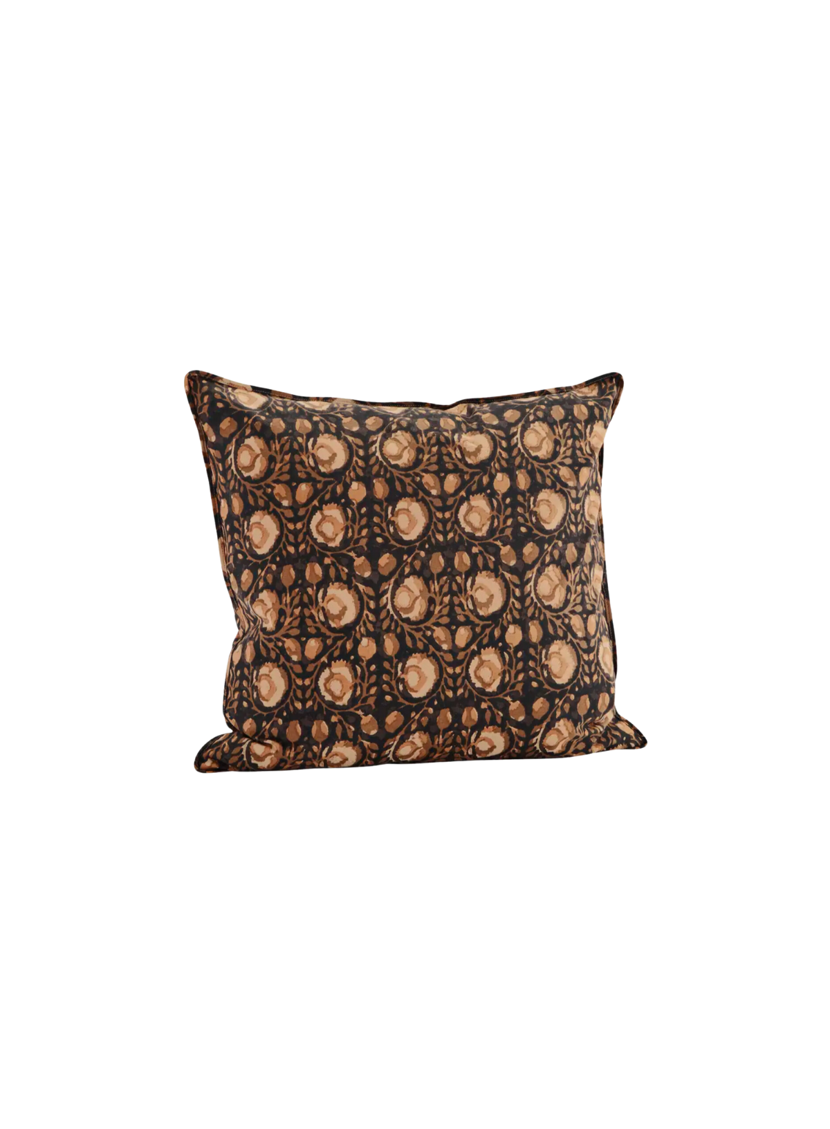 This cushion is inspired by Indian block prints, featuring a refined palette of oranges, browns, and peach tones. To preserve its rich colours, avoid direct sunlight exposure. Featuring a discreet zipper, the cover is crafted from durable cotton that is machine washable at 30°C for easy care.