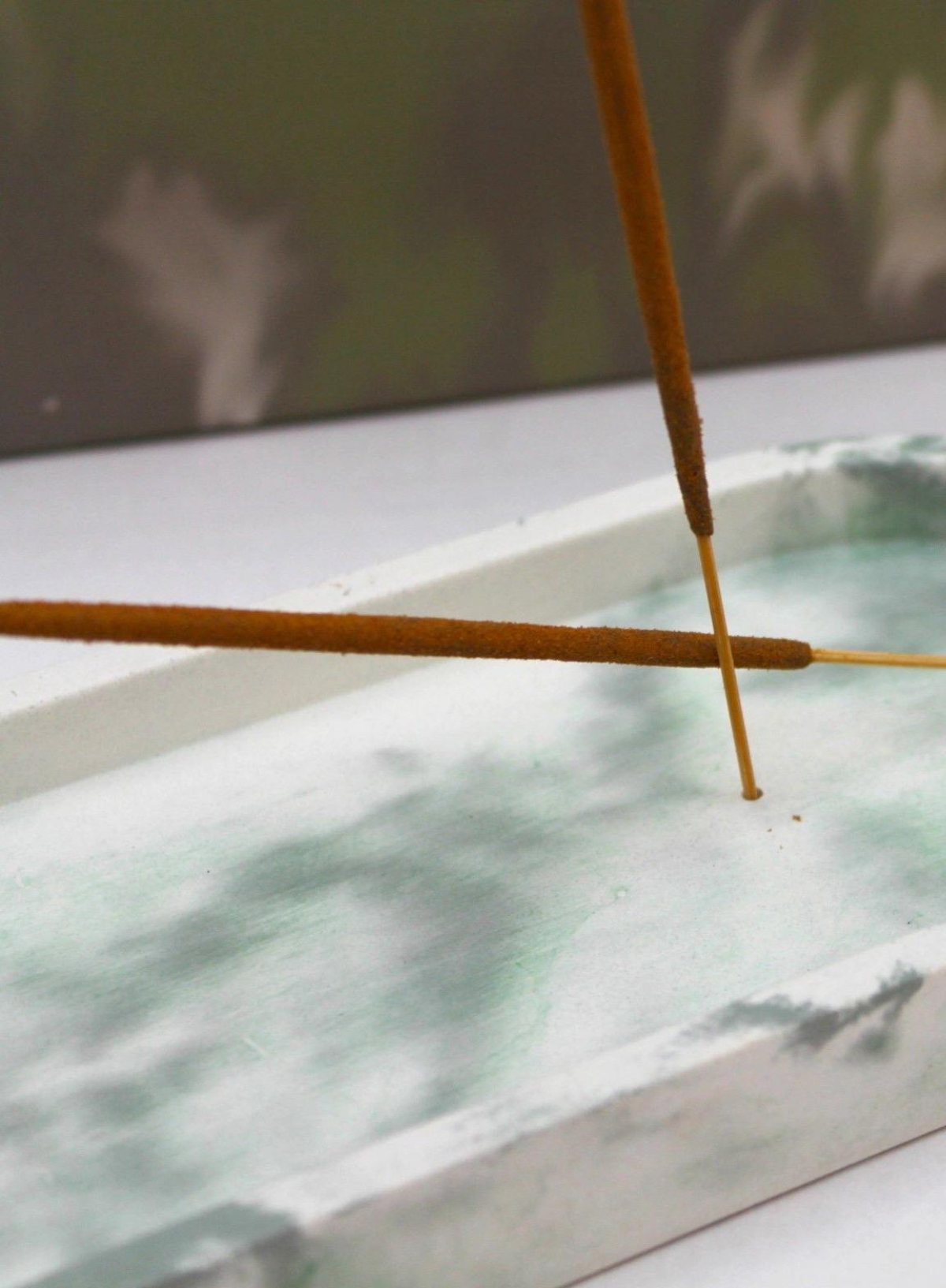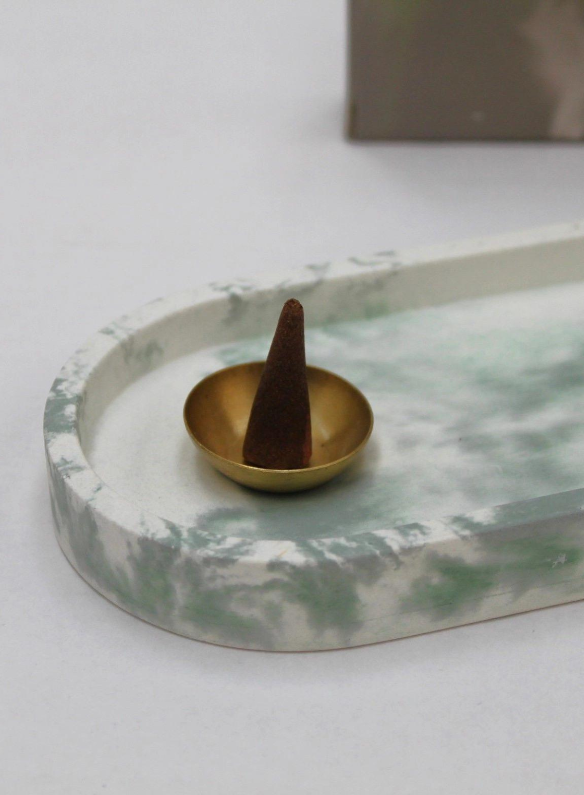 Discover a multi purpose desk/table tray designed to accommodate both incense sticks and cones. Each vessel boasts a distinctive hue, thanks to the dye infused during manufacturing, ensuring that every piece is truly one-of-a-kind. Custom made smooth concrete designed in the wxy. studio with unique dye colouration.