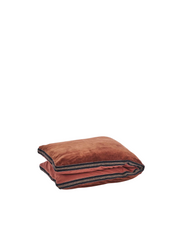 Perfect for a daybed, bench, or terrace deck, it features soft velvet on one side and robustly woven cotton on the other, separated by a striped cotton band.