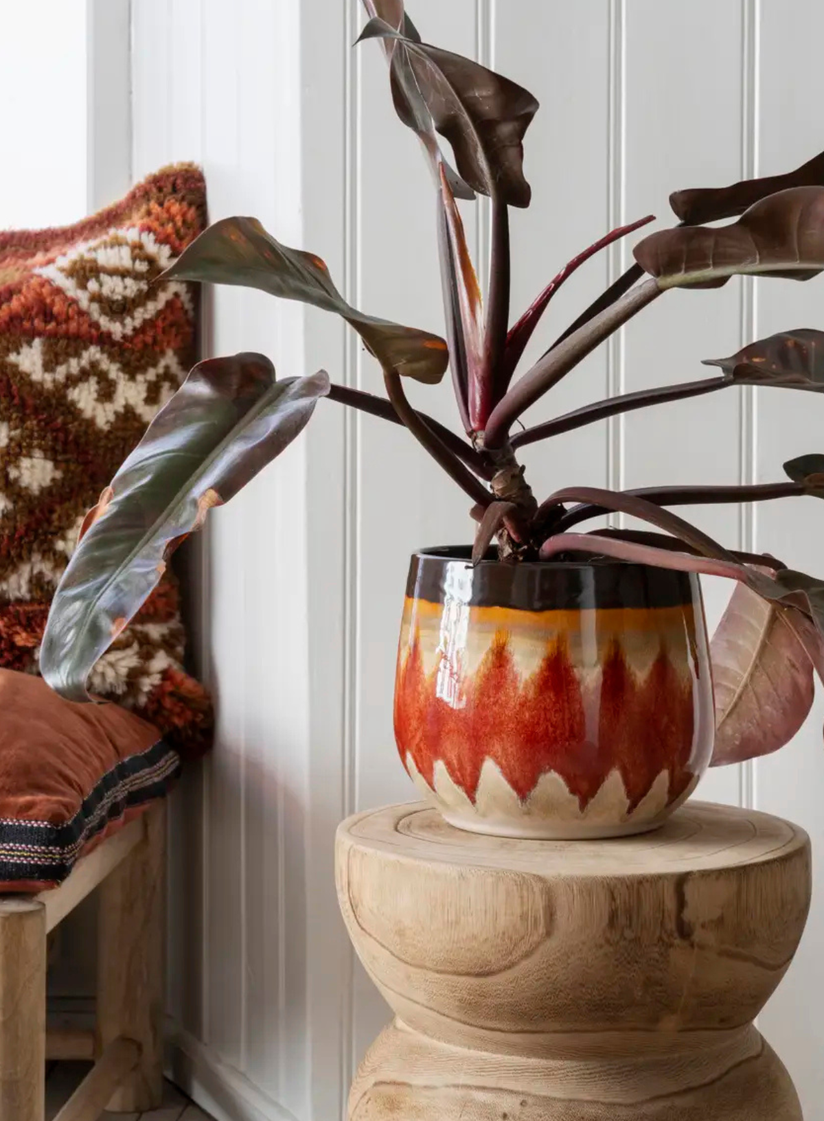 This cotton velvet seating mat, crafted in India, combines elegance and comfort with burnt red and black hues.