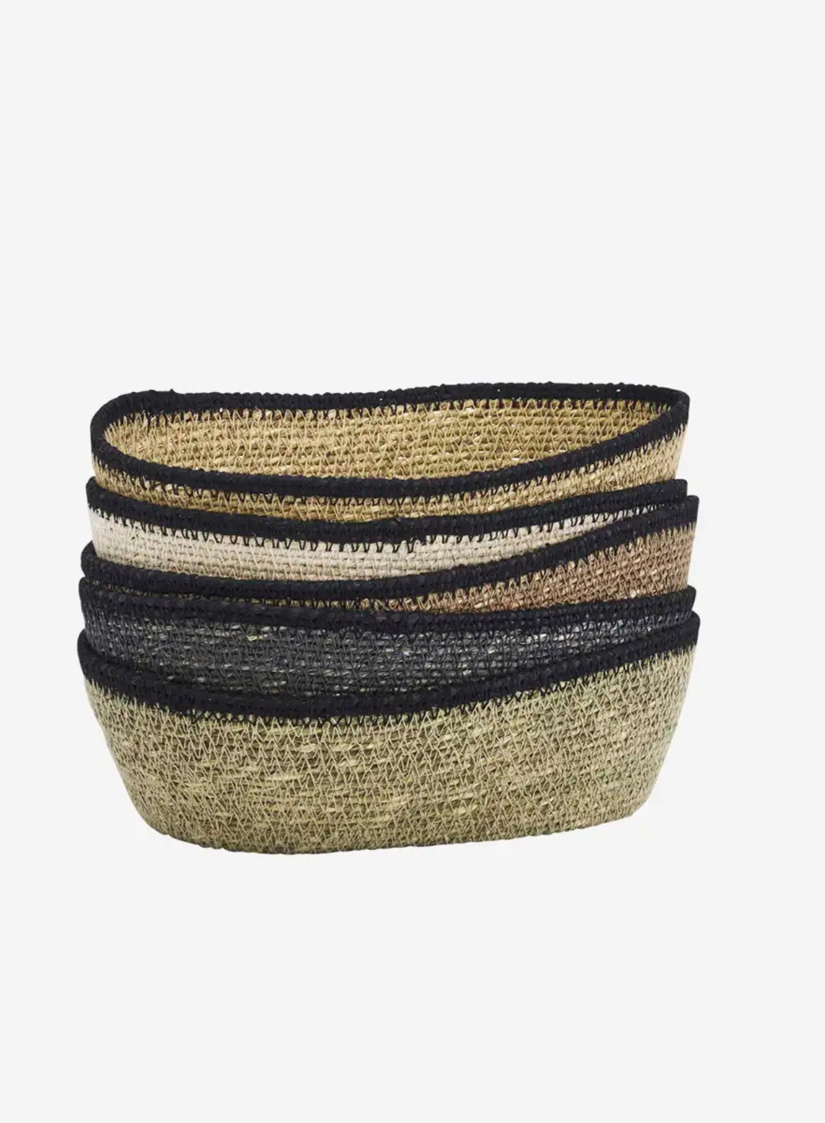 This oval seagrass basket, crafted in India, combines seagrass and cotton thread in charcoal, walnut, sage, natural, off-white, and black hues.