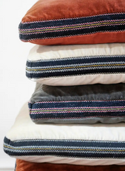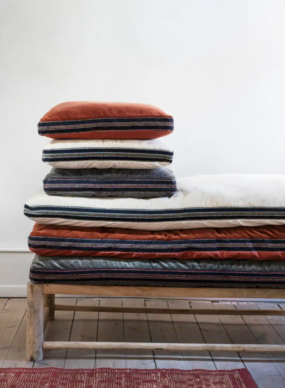This cotton velvet seating mat, crafted in India, features a soft velour side and a sturdy woven cotton side in matching colors.