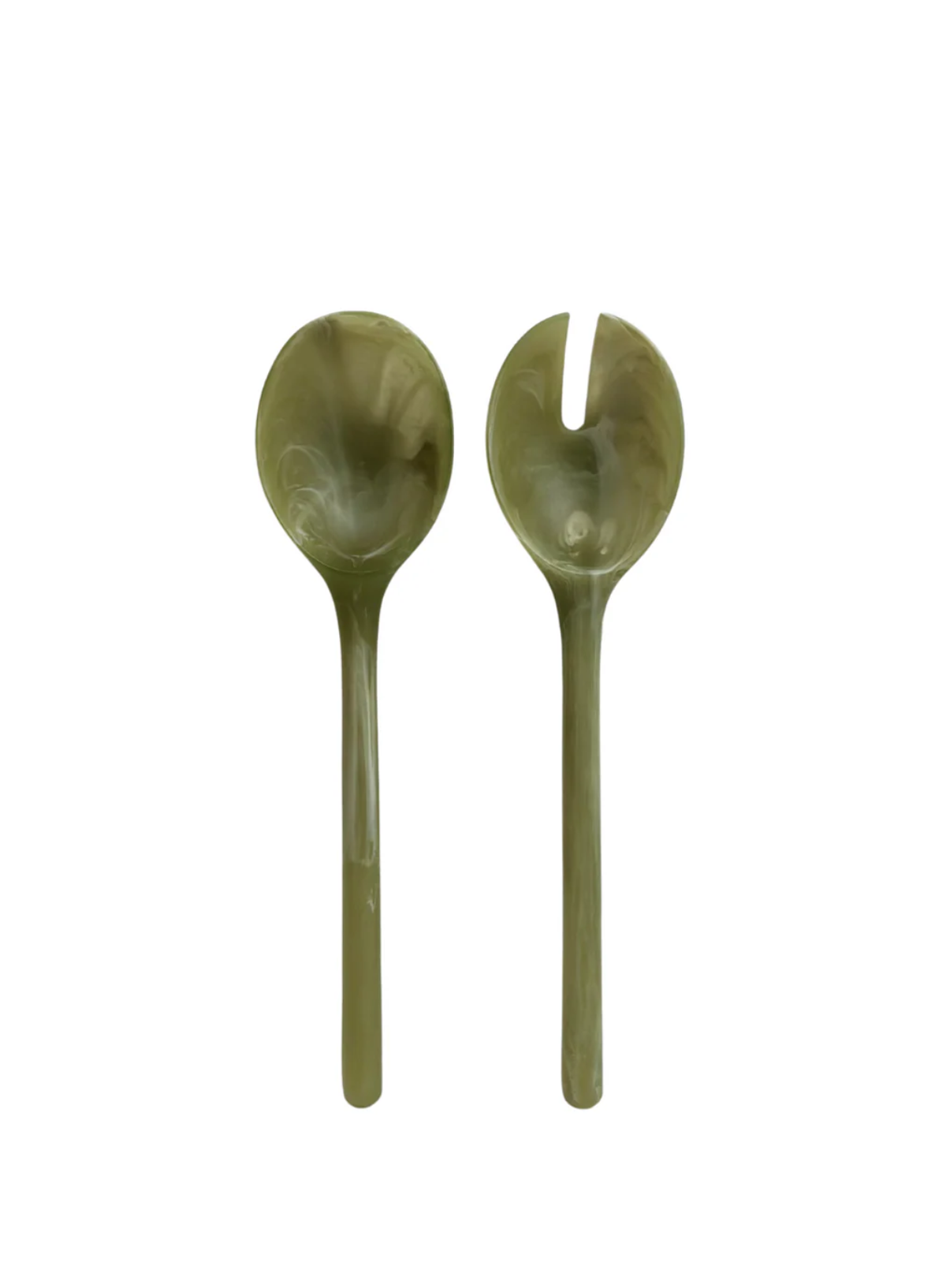 Elevate your dining experience with these sleek resin salad servers in a stunning marbled olive green.