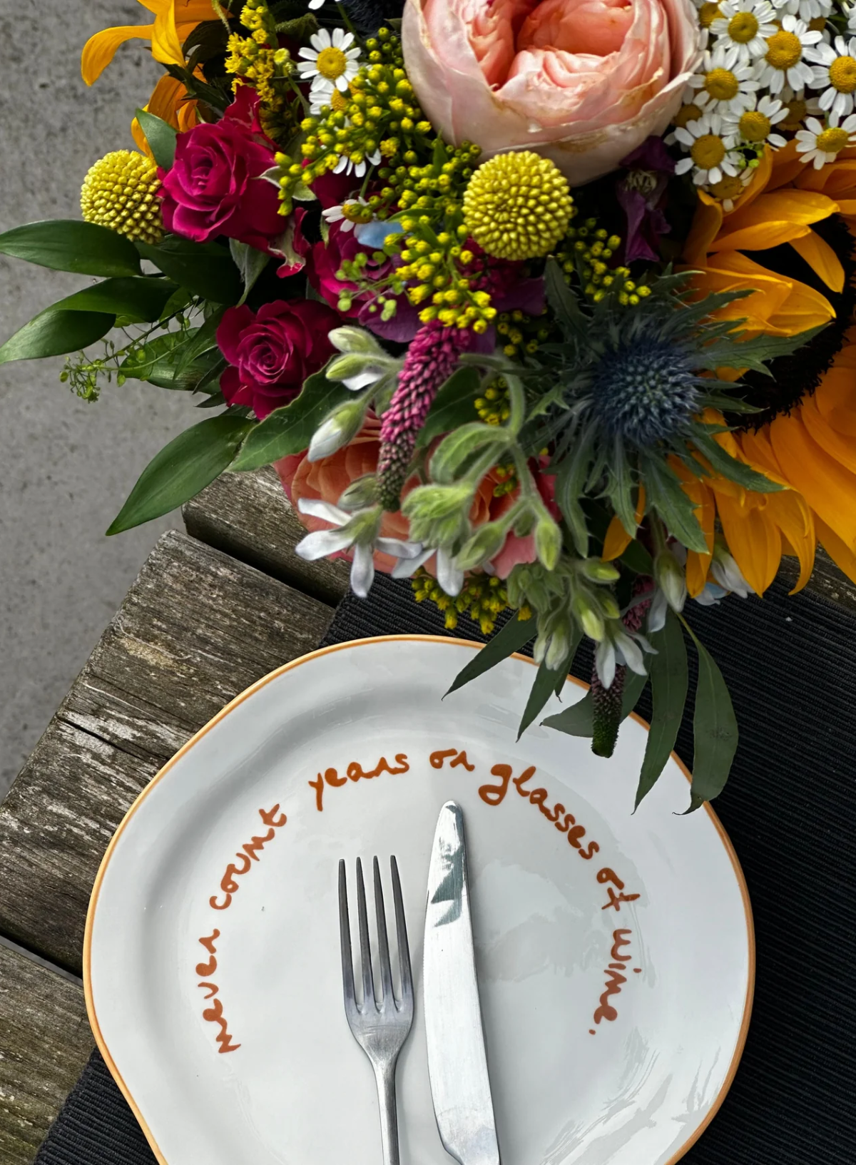 MÆGEN Slogan Plate "Never count years or glasses of wine " in Orange