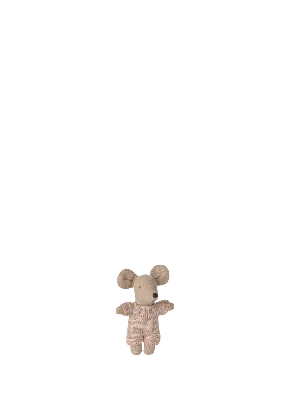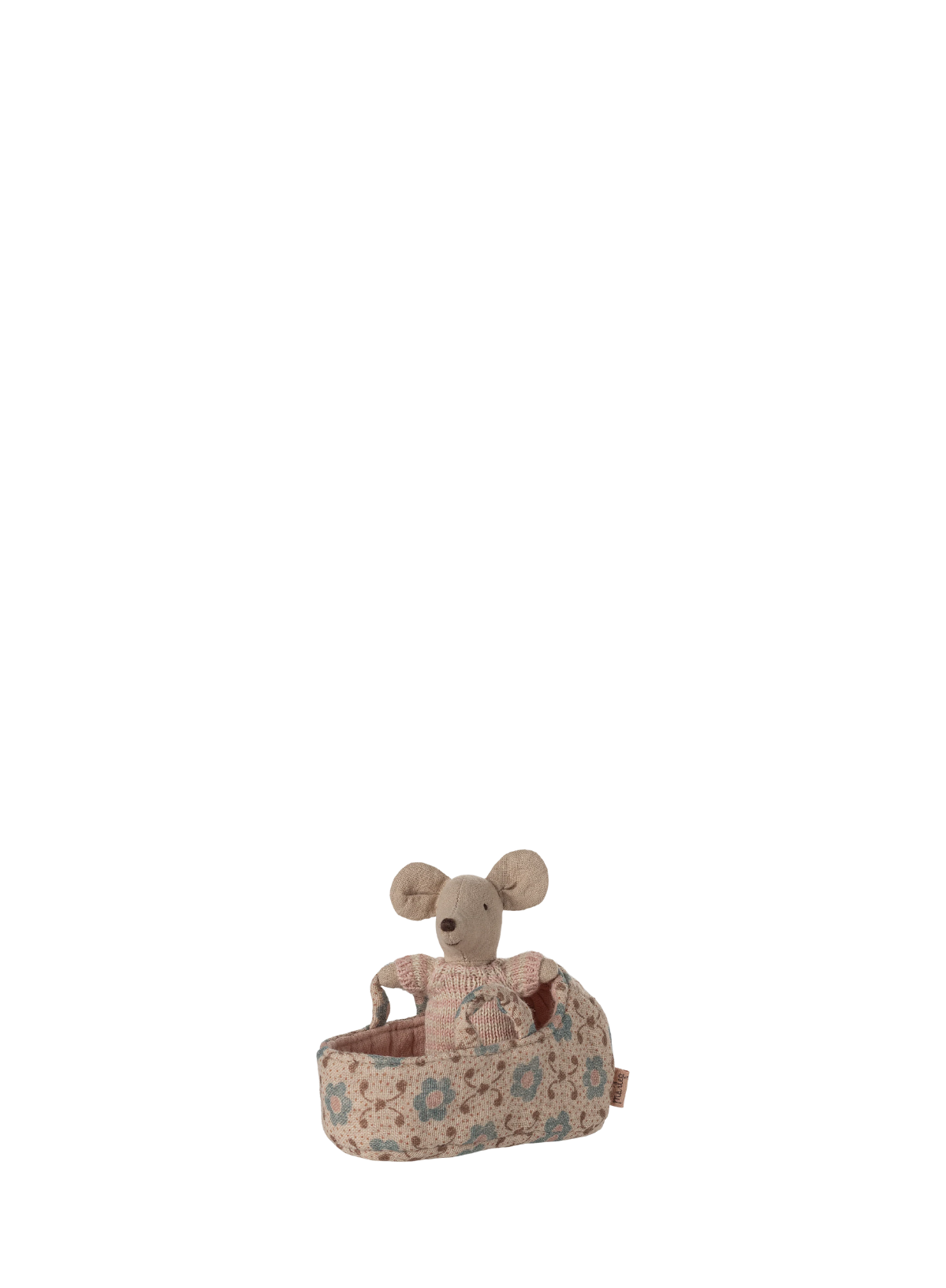 A small Maileg baby mouse in a soft and striped knitted suit. It sleeps for hours in its little quilted carry cot.