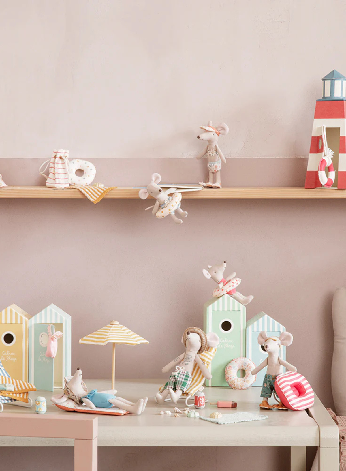 Vacation time. This small bag includes all must-haves for a day in the sun: sunscreen and 2 sodas. All comes in a miniature size that fits the smallest Maileg mouse. Please note that you can not open the sunscreen and soda cans.