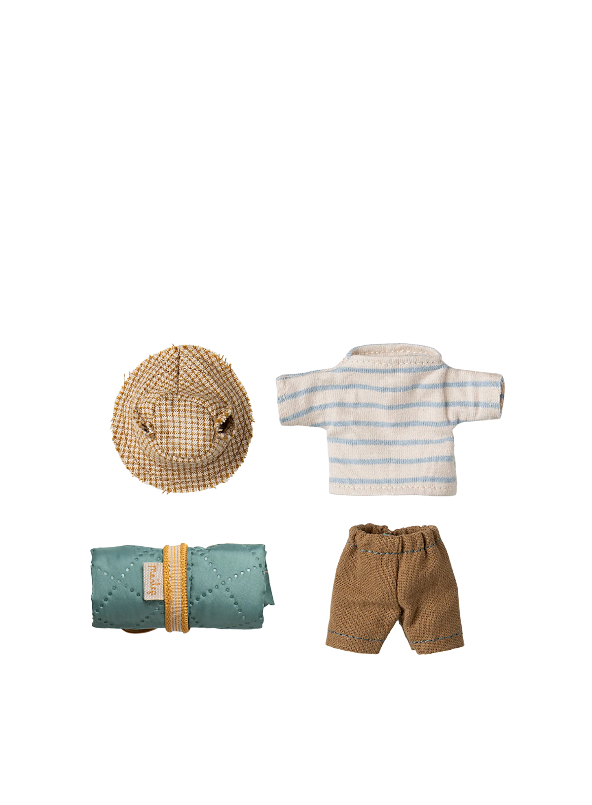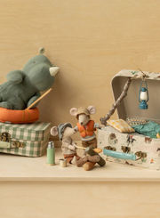 This Maileg mouse is well-prepared for a hiking trip in the wild nature. He is dressed for days of walking and brings his sleeping bag for nights under the stars. He has magnets in his hands. Add more accessories from the hiker collection for more play.