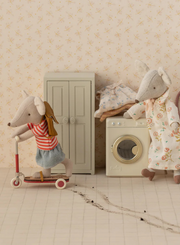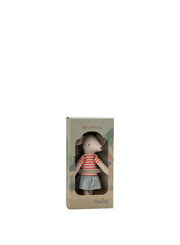 This Maileg mouse is the sister of LouiMax and she wears a red striped t-shirt and a denim skirt. She has magnets in her hands and is sold in a very nice decoration box.