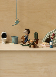 A fantastic set for hours of play. A Maileg cowboy mouse with magnets in his hands, dressed in jeans, a scarf, and a cowboy hat, rides on his rocking horse. Notice the small tail hole on the horse—a detail for the observant consumer.