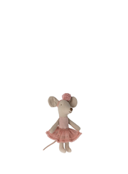 A Maileg little sister mouse dressed up like a graceful ballerina. She wears a beautiful rose colored tutu and a beautiful headband - ready for hours of dance.