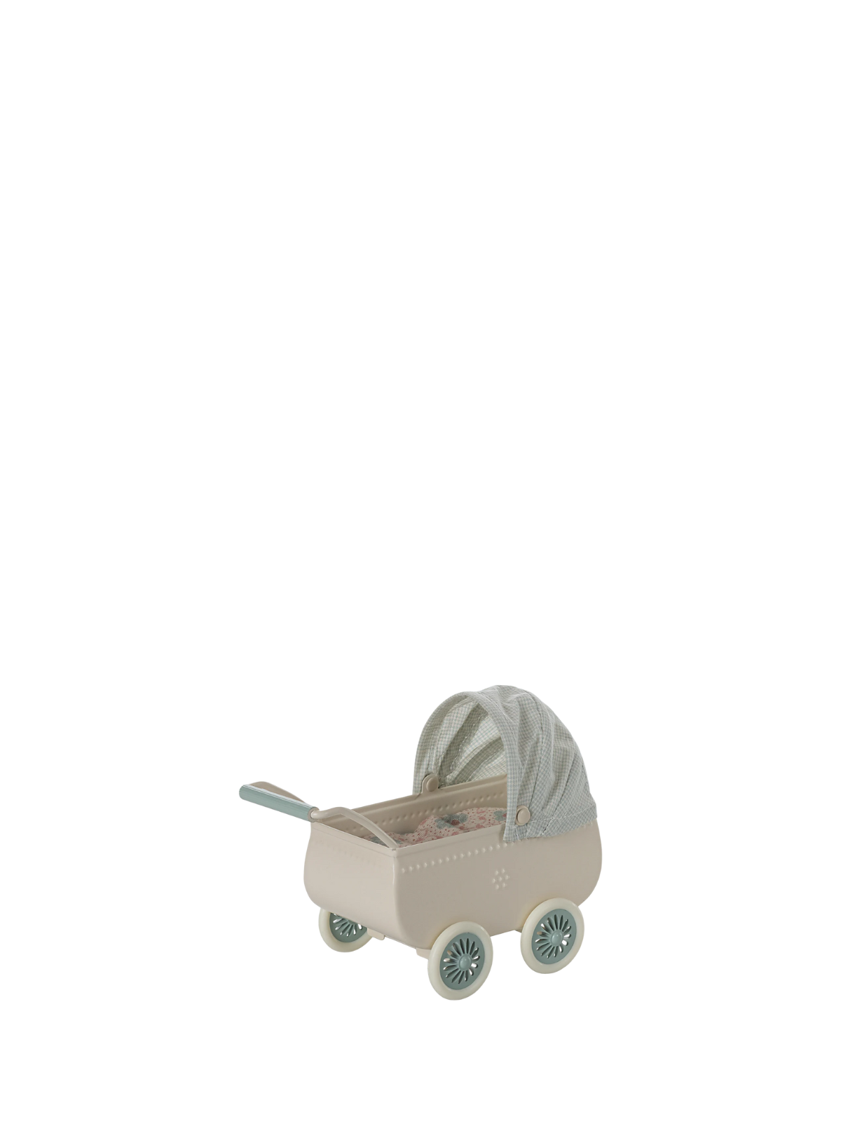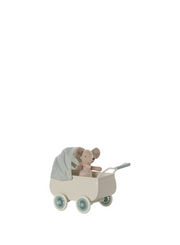 The beautiful pram has a vintage look and comes with a small mouse in a sleeping bag. The mouse is laying on a soft mattress in the pram and will sleep for hours.