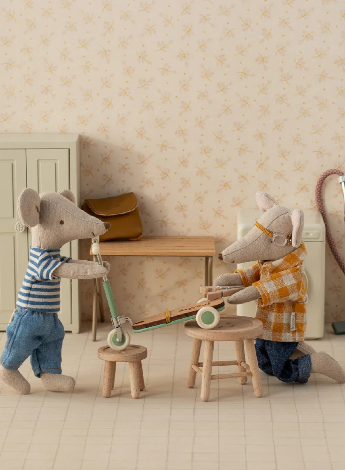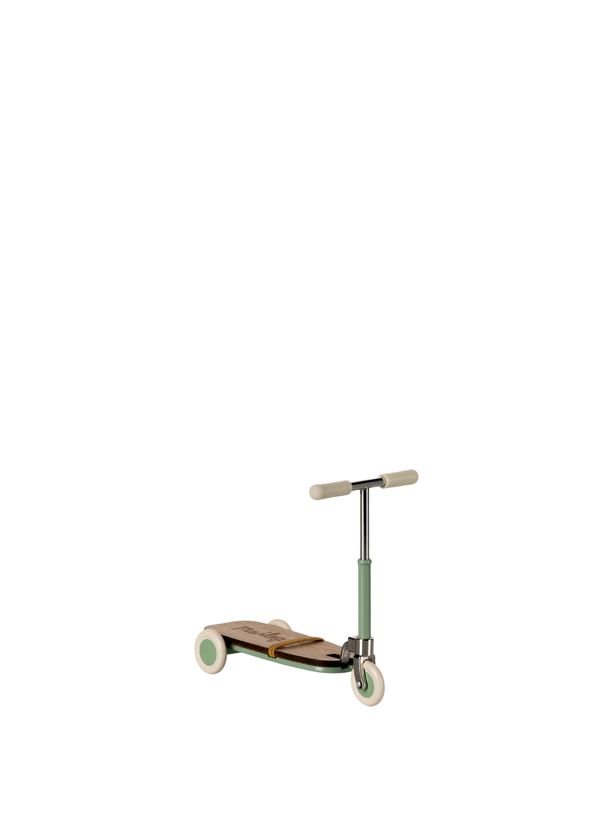 A kickboard with wooden details. The kickboard has a metal stick in the handlebars that makes sure Maileg mice with magnets in hands can stay on the board. A small elastic is added on the board and will secure the feet on the board during the ride.