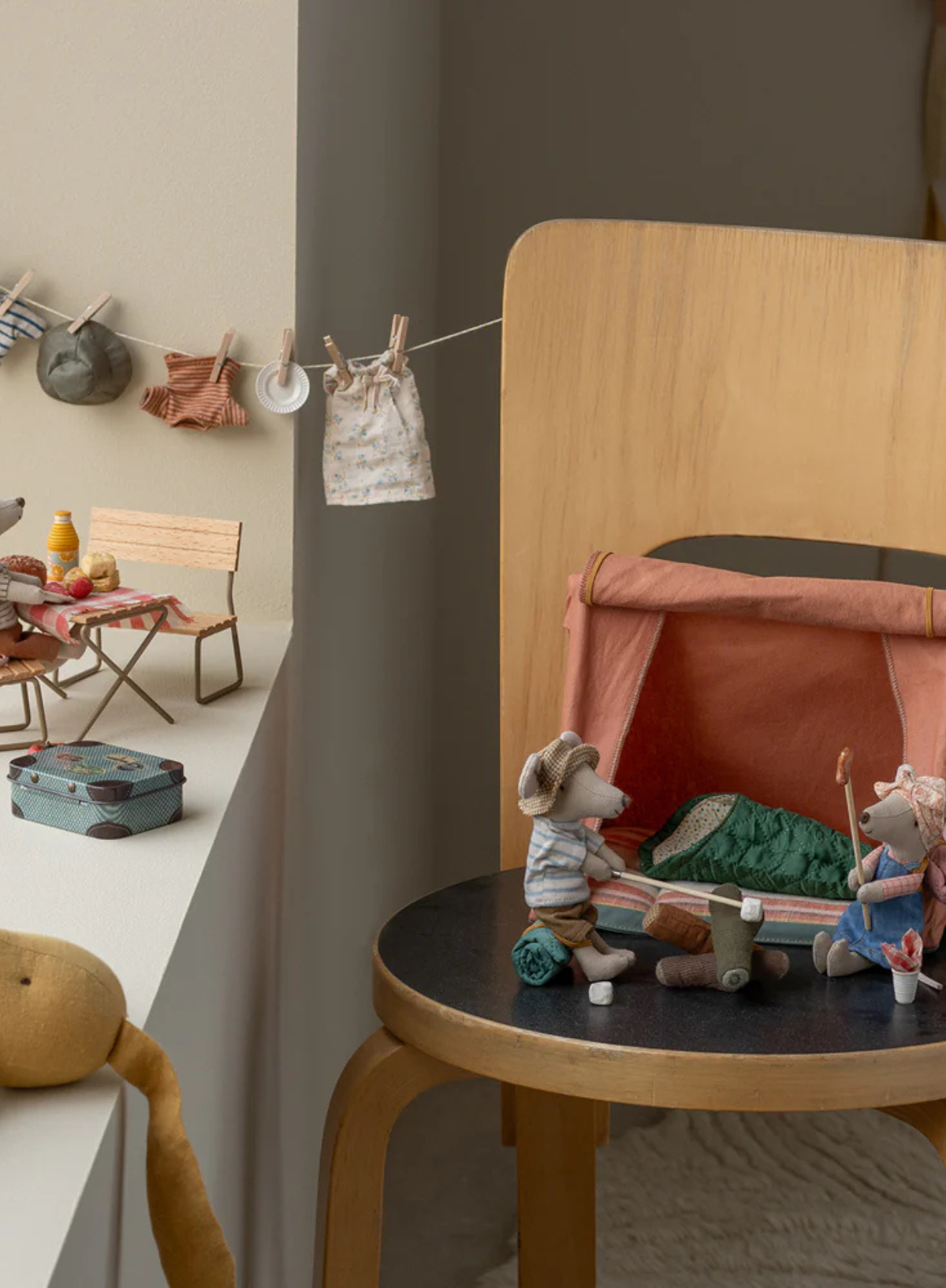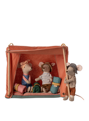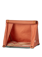 Take your Maileg mice for a sleepover in the fold-up tent. The wooden sticks can hold the tent door up and give shelter from the rain. The outer fabric has a coated surface for a more authentic look. Remember to ask them to bring their sleeping bags.