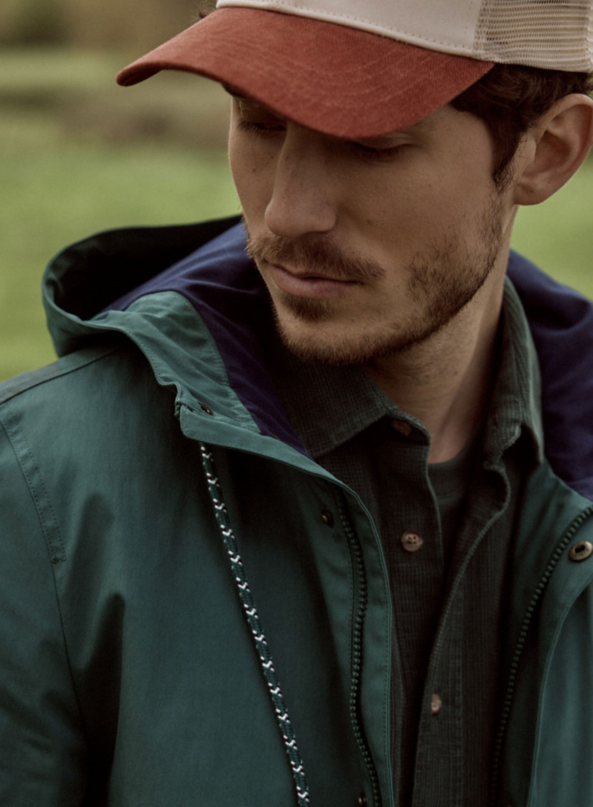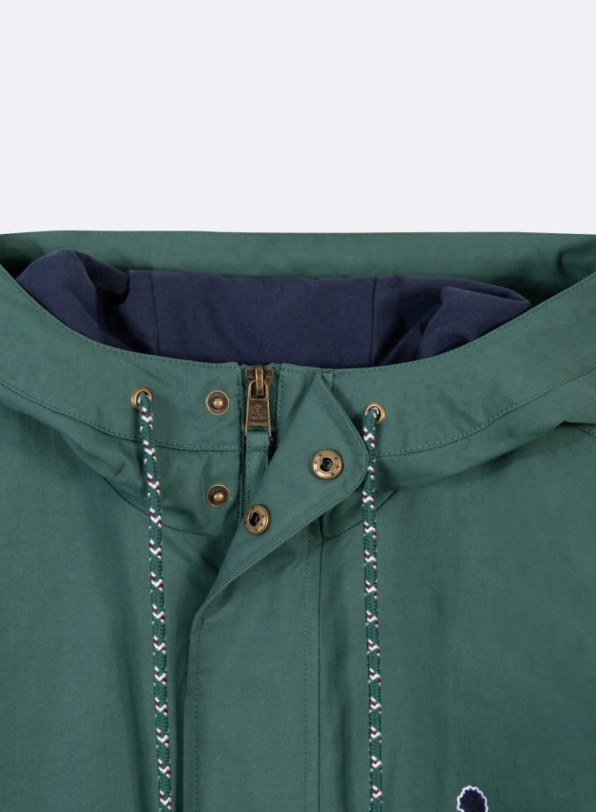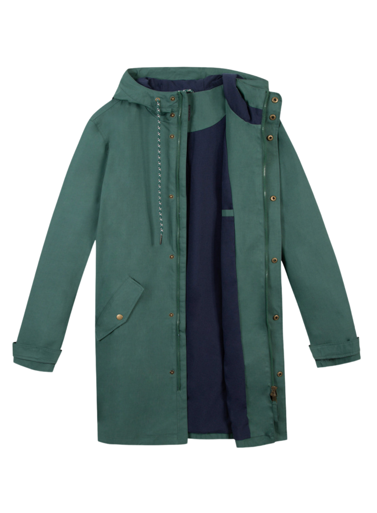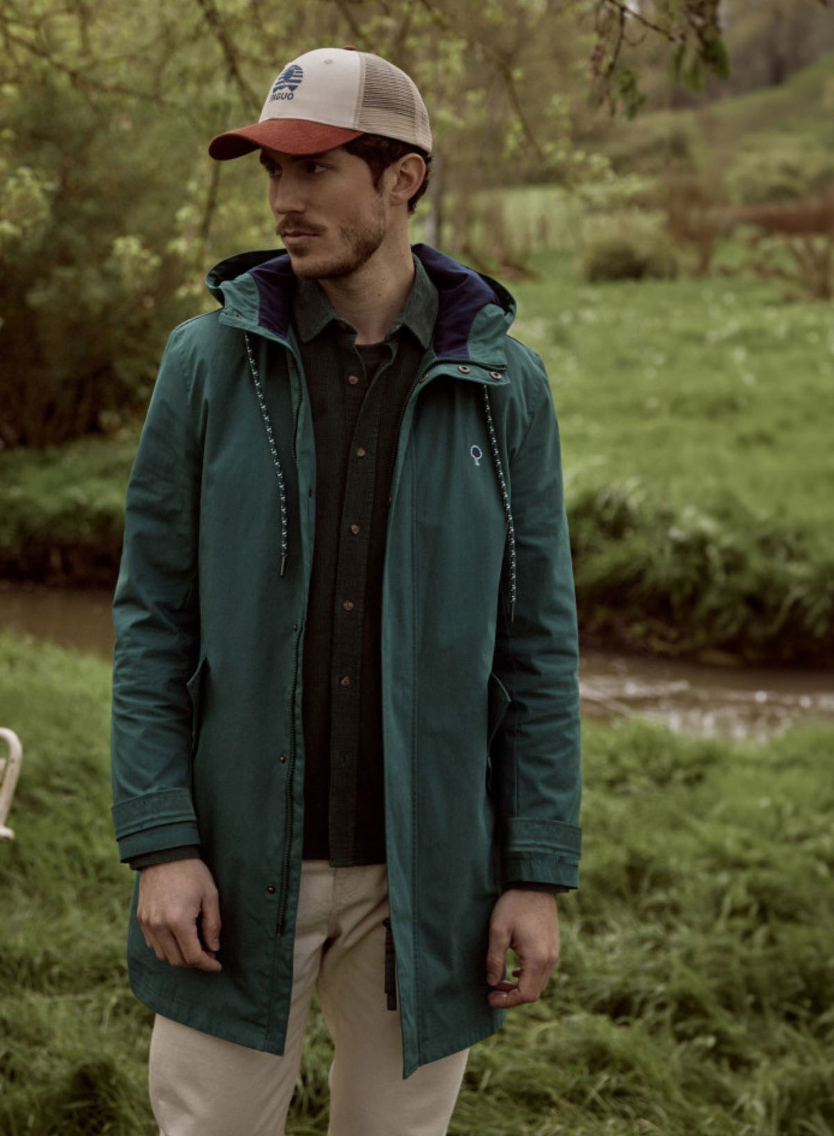 GRESIGNE green is a raincoat inspired by the world of the outdoors. It is practical in bad weather thanks to its hood, its length and its water-repellent fabric.