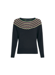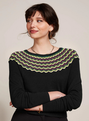 Knit top with a round neckline and long sleeves. With an open-knit motif with flitter on the yoke, with ribbed cuffs in a stretch material.