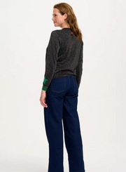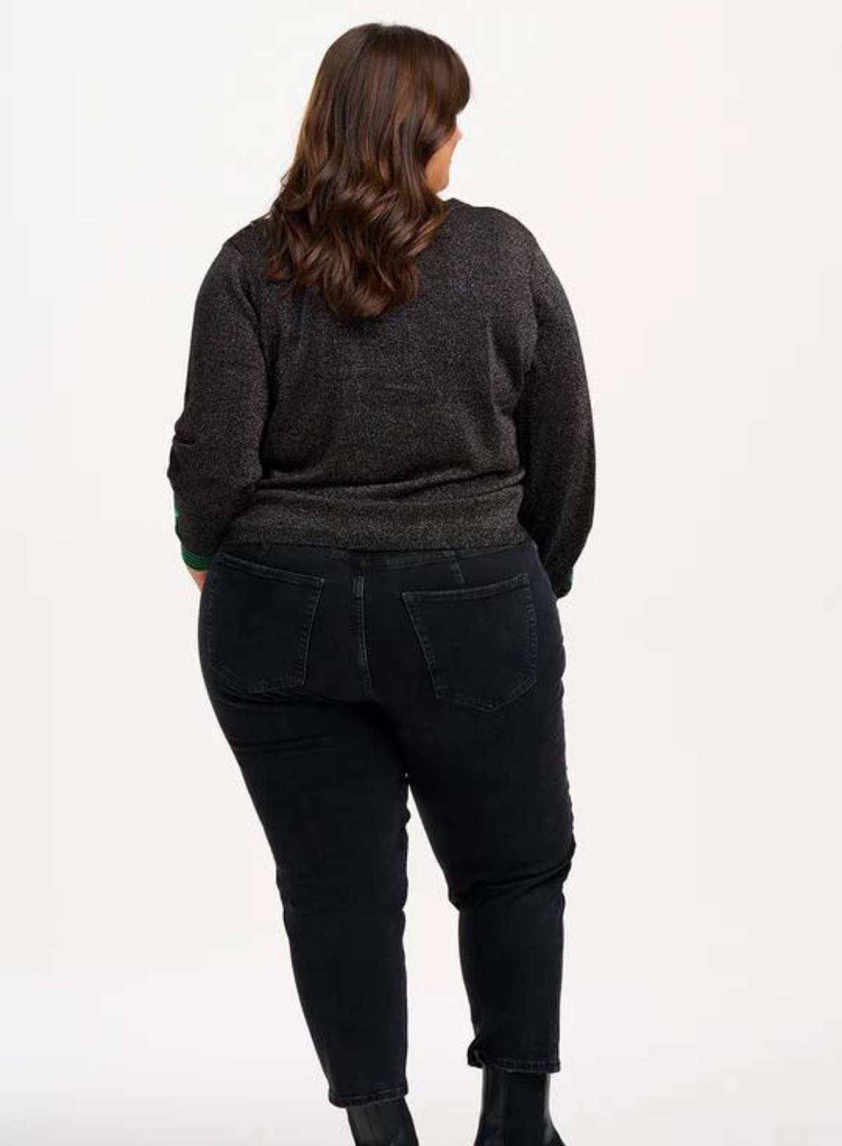 The Arya Cardigan has a flattering semi-fitted shape, a deep v-neckline, ribbed cuffs and a functional button front in a metallic yarn. Arya features green stripes and stars on the sleeves for a sporty-but-chic look.