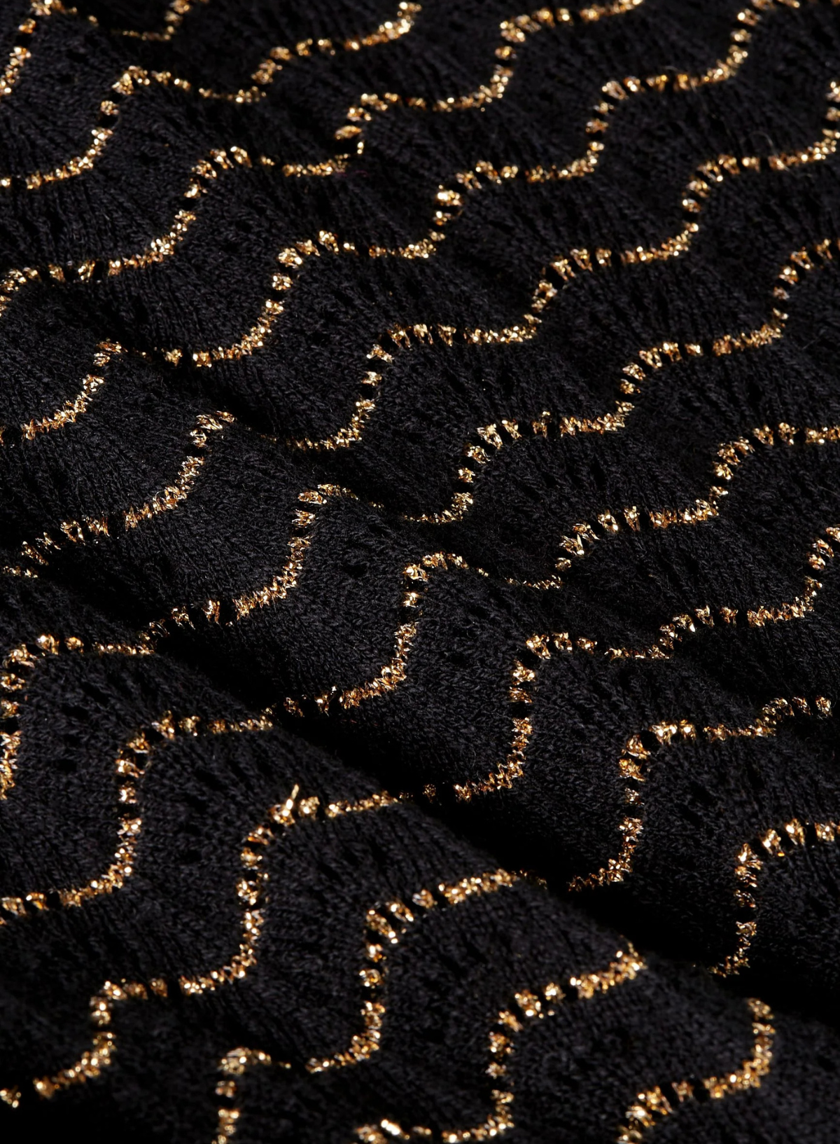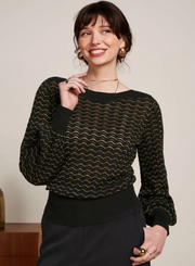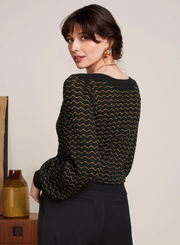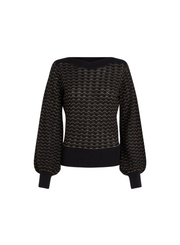 Boatneck top with long puff sleeves with wide cuffs and ribbed trims. In an amour knit in a stretch wavy pattern with glitter.
