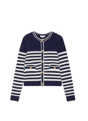 Featuring stylish gold buttons and two convenient patch pockets, this midnight blue striped cardigan is the perfect blend of fashion and function.