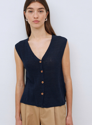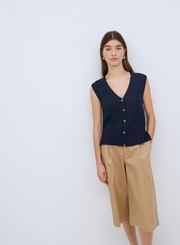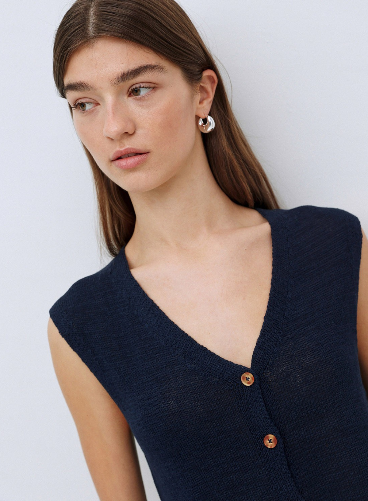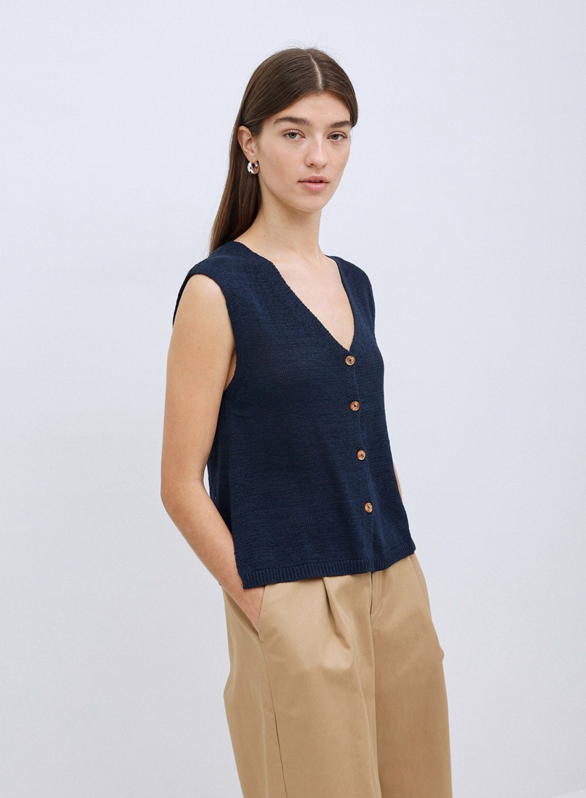 Flat-knit vest. Cotton and linen blend fabric. Straight cut. V-neck. Tortoiseshell-style button fastening. Side slits.