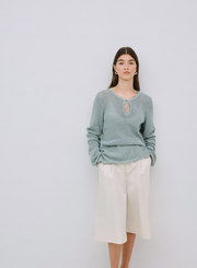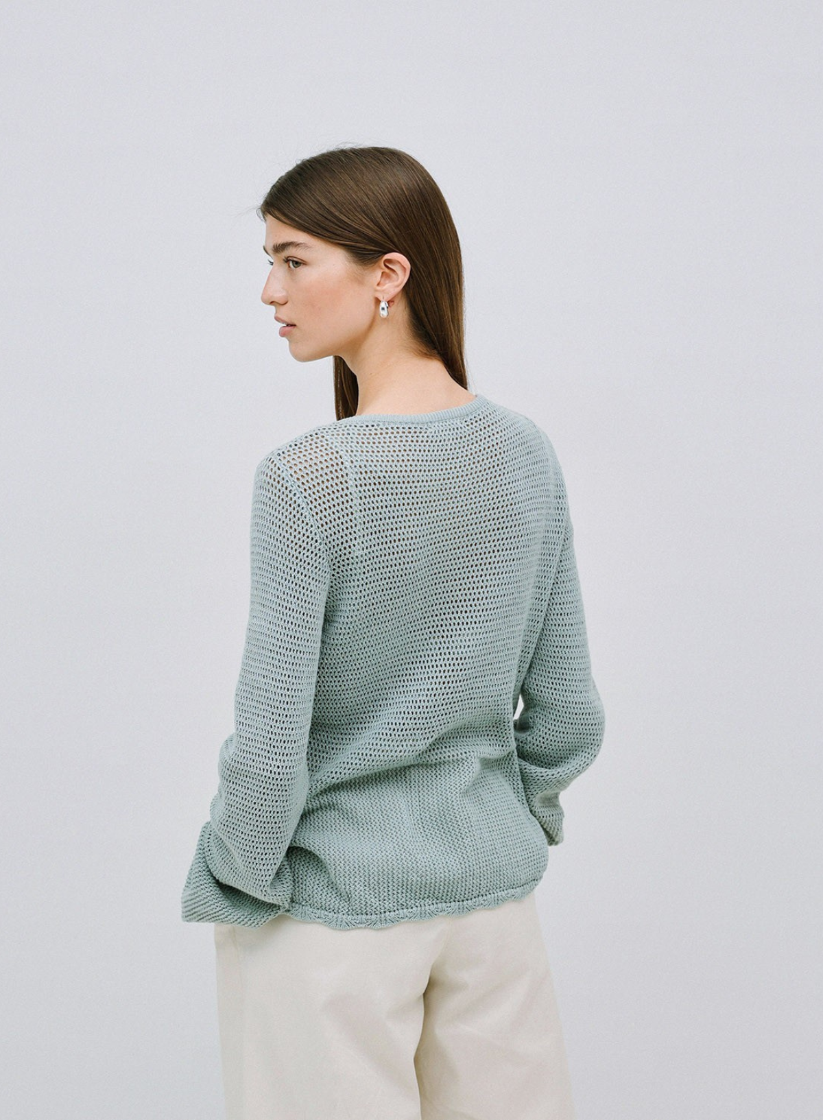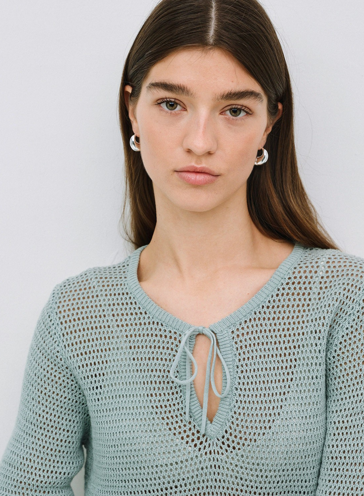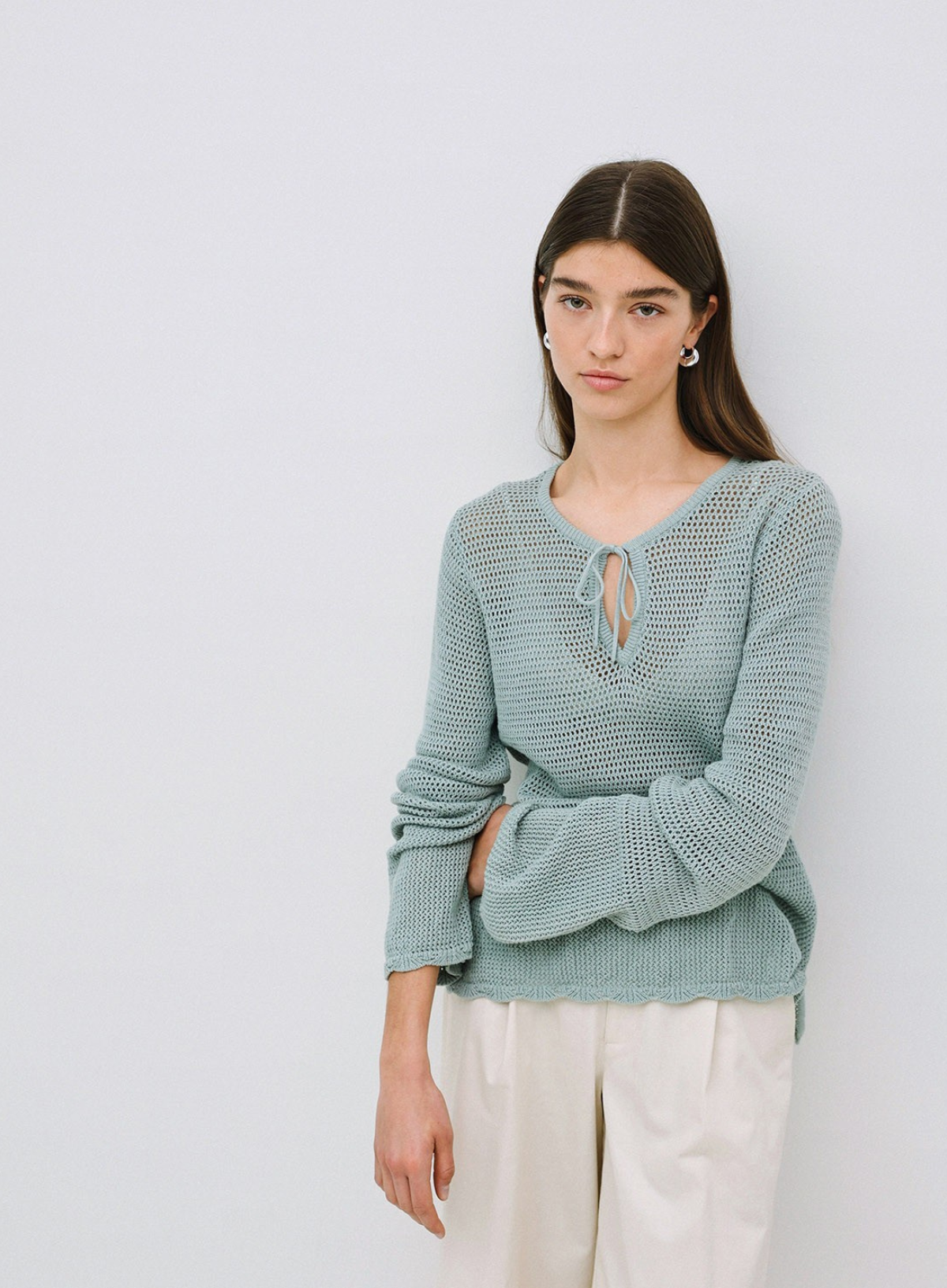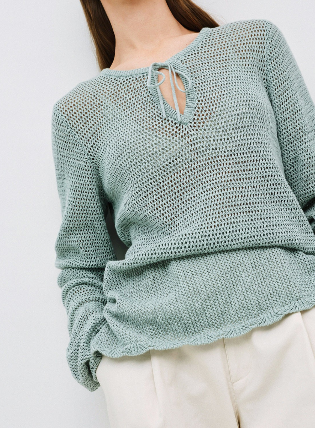 Openwork knit jumper. 100% cotton fabric. Straight cut. V-neck. Long sleeves. Tie-up detail at the neck. Side slits at the hem.